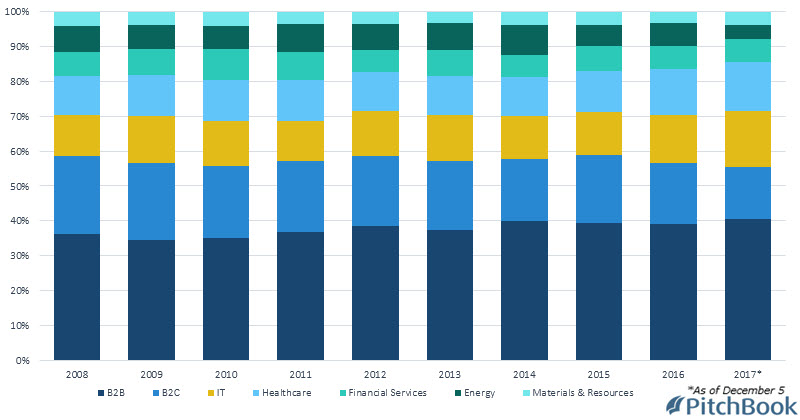 2017年(截至12月5日),美国所有私募股权投资交易中,约40.4%是B2B行业贡献的,份额自2008年以来增长超过11%。