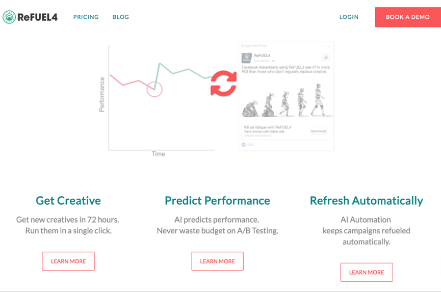 它使用Facebook和Instagram的API和神经网络图像识别技术解决方案来创建他们的广告。让近10,000名设计师48小时内响应你的需求,72小时内让你获取新的广告素材。同时ReFUEL4还拥有AI预测性能,使你不再浪费A、/B测试的预算。