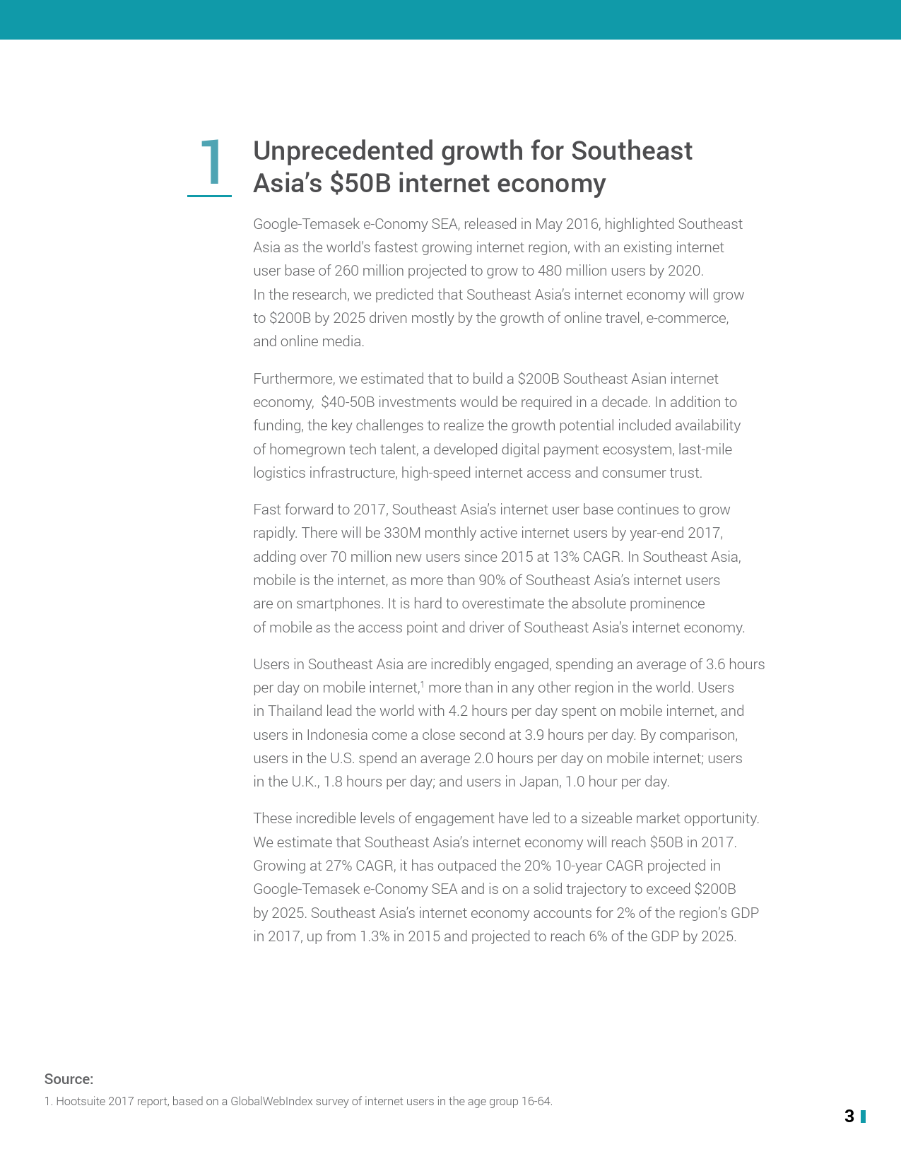 “东南亚的互联网用户非常活跃,每天在移动终端上平均花费3.6个小时,比世界上任何其他地区的用户都要多。这一令人难以置信的参与度,为该地区的互联网企业带来巨大的市场机遇。”