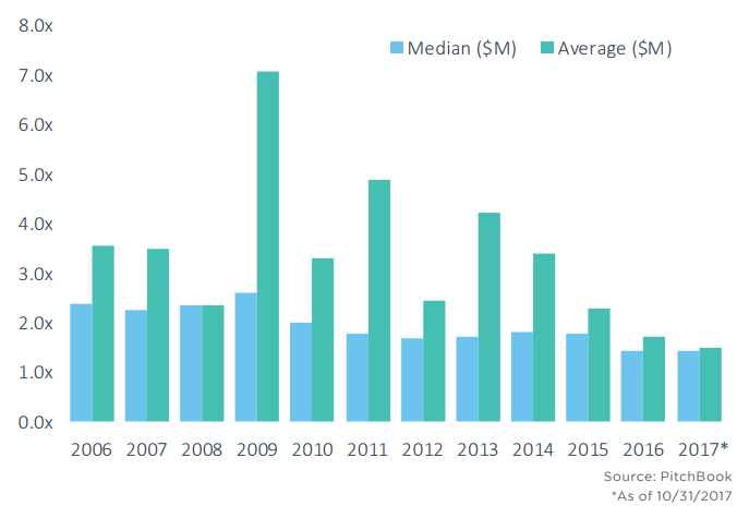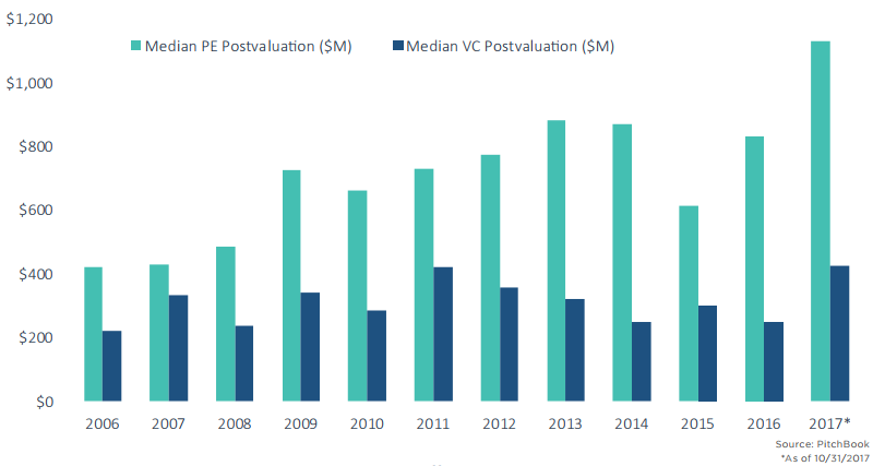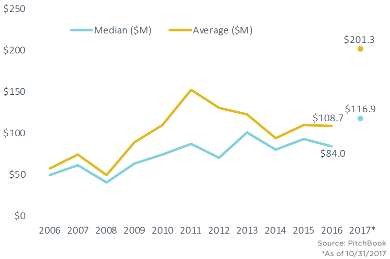 PitchBook的数据证明这些结论。2017年,风险投资额中位数和去年比增长39%,平均值同比增长85%。