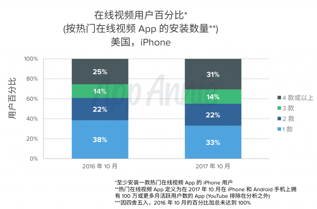 iPhone 上安装 4 款或更多热门在线视频 App 的用户数量比例的增长说明,市场正在进一步细分化。