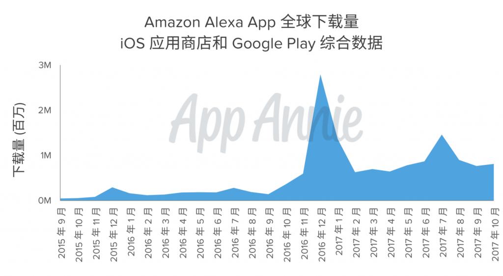 在 2016 年 10 月推出不足 50 美元的 Echo Dot 之后,Amazon Alexa App 的下载量有所攀升,在假期季和亚马逊 Prime 会员促销日期间出现明显的高峰。