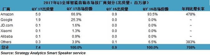 Strategy Analytics近期发布的2017 Q3智能音箱季度报告中的关键发现包括: