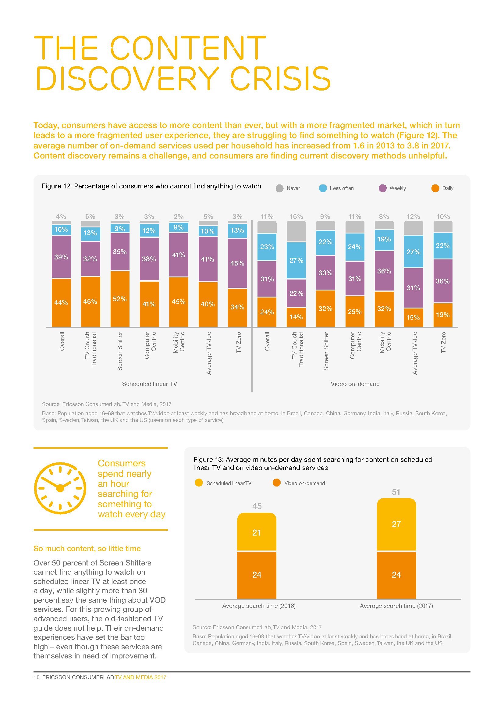 随着电视和视频服务数量的增加,人们搜索内容的时间也在增长(13%),接近每天一小时。目前,内容发现能力和消费者设备和视频服务使用量不匹配,因此7/10的观众认为通用搜索功能非常有用。