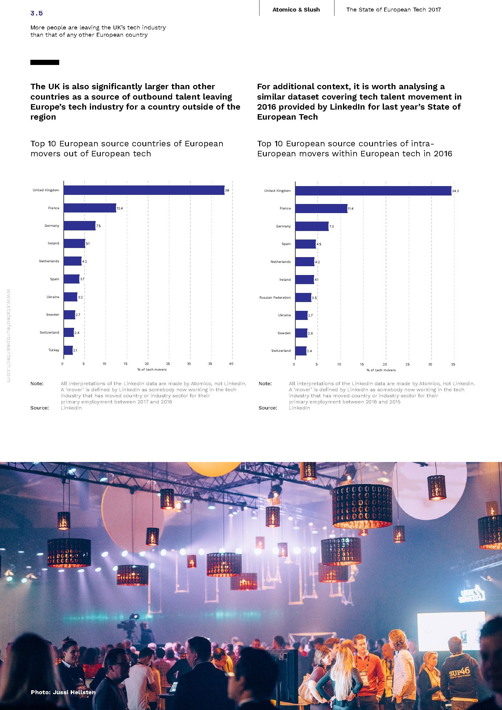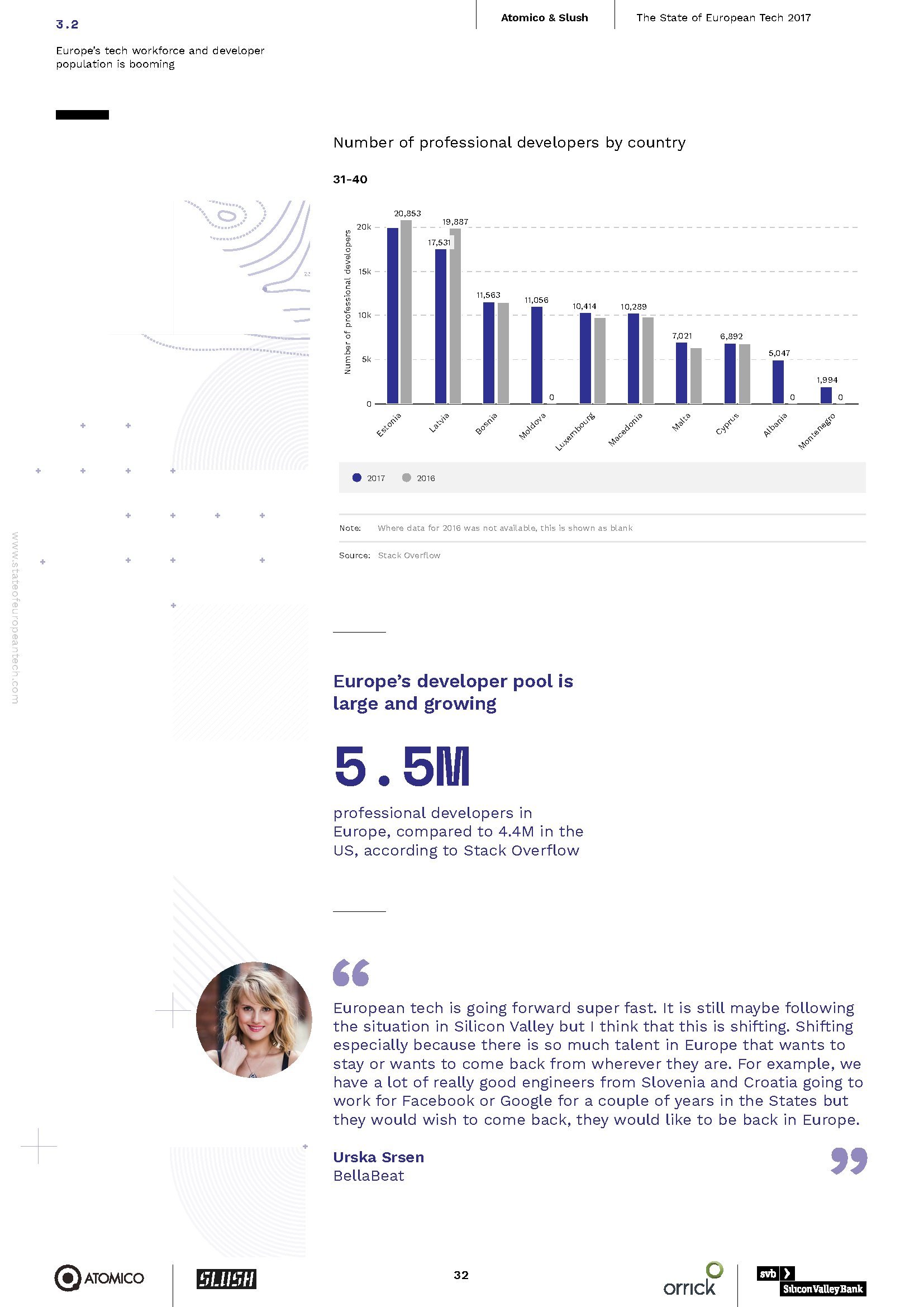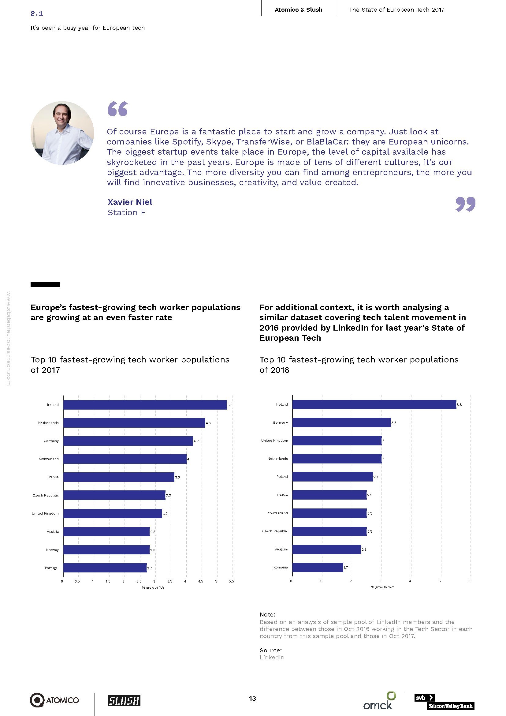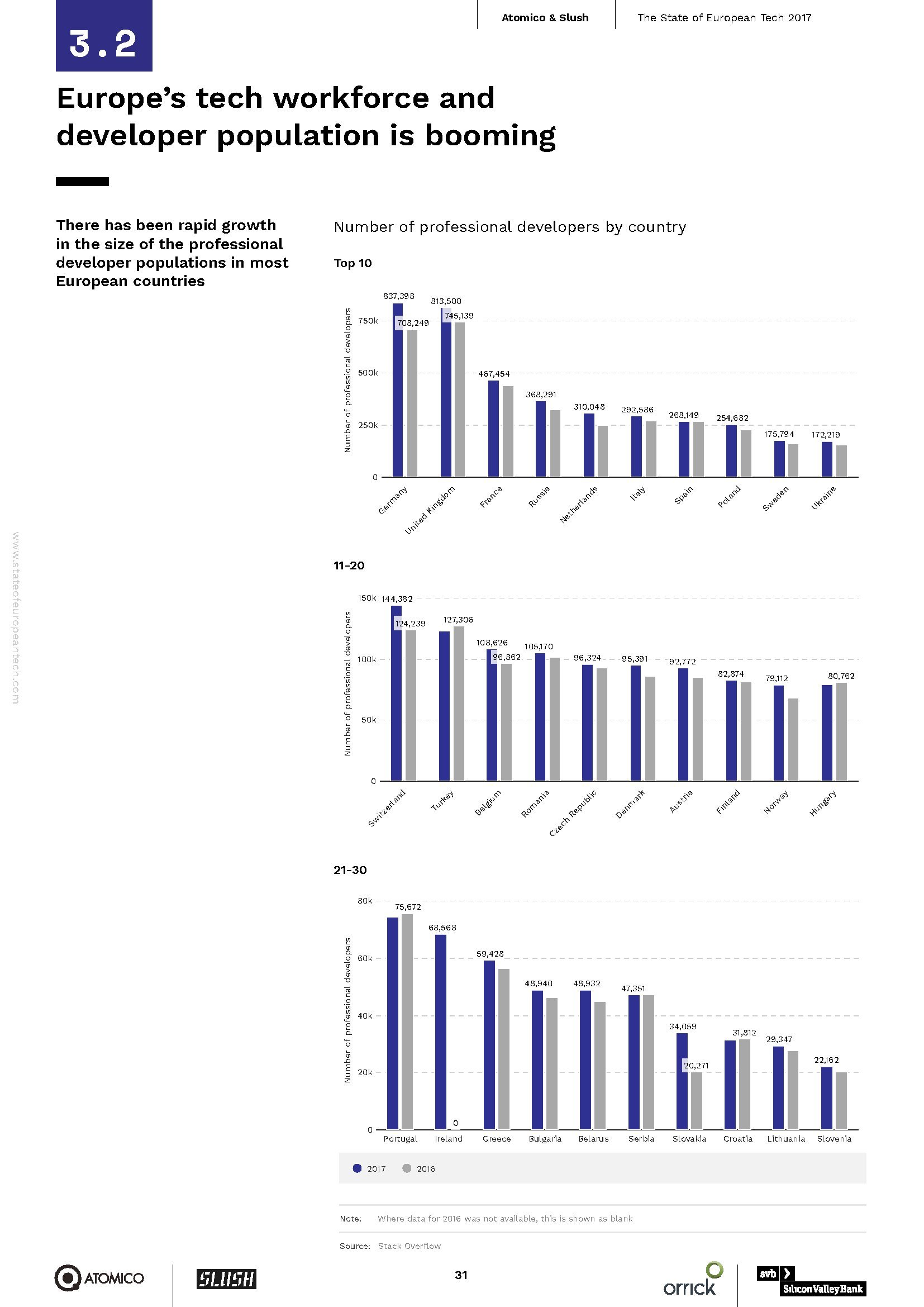 Atomico & Slush发布了“2017年欧洲科技行业报告”,在拉动就业方面,科技行业远超过其他欧洲行业。2017年,欧洲科技行业劳动力增长2.6%,而欧洲整体劳动力增长只有0.8%。