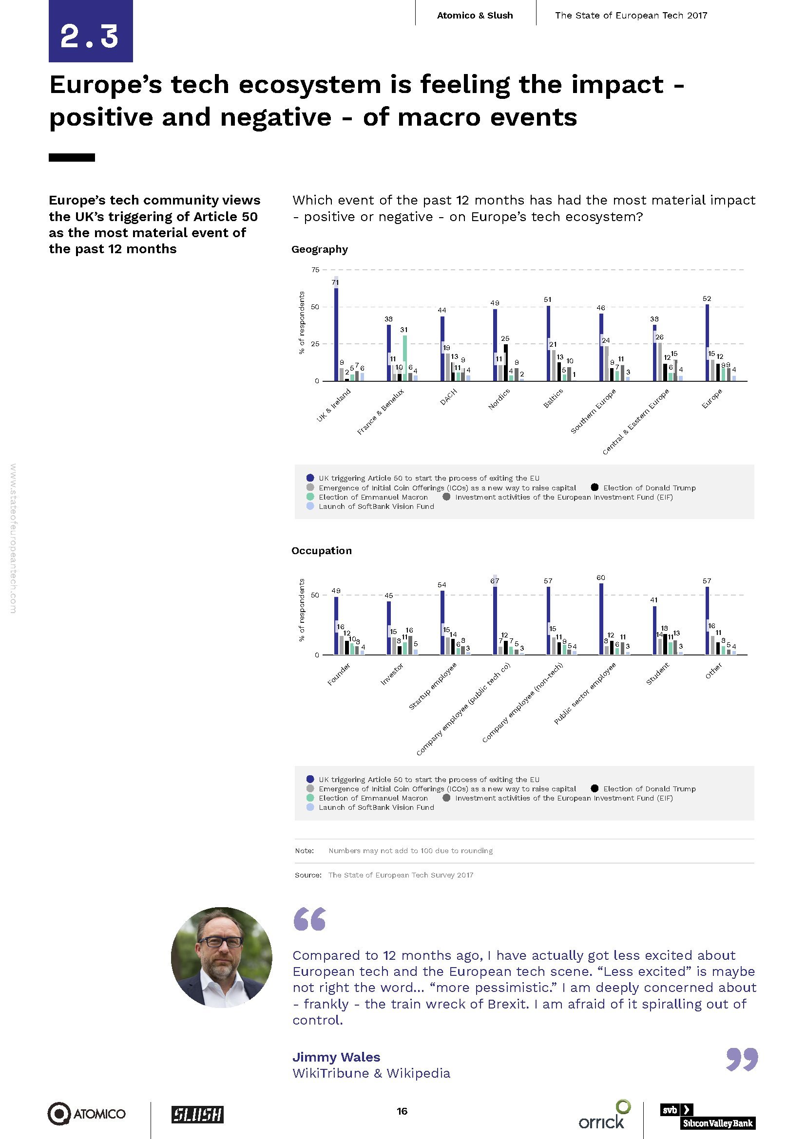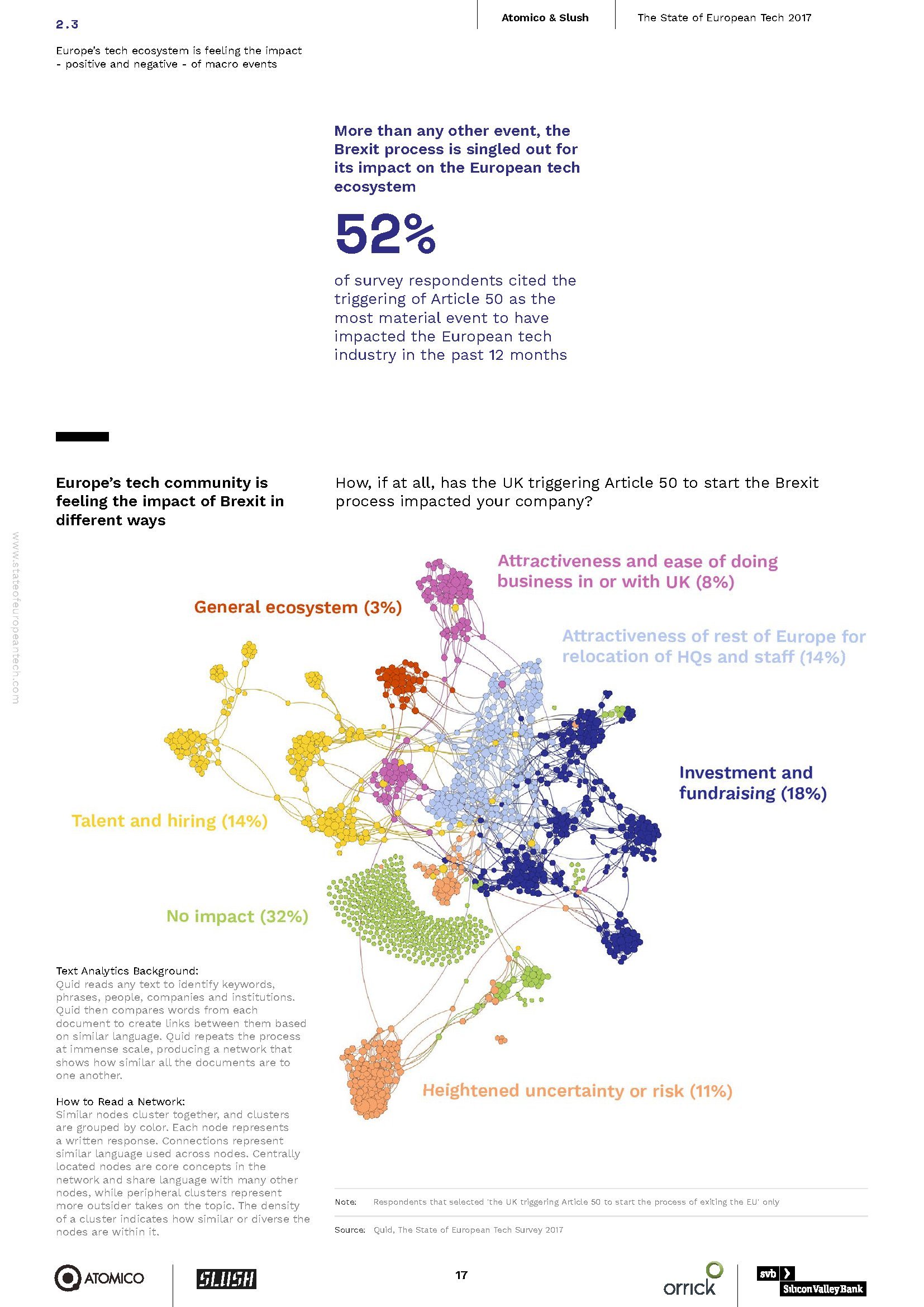 而英国脱欧则是对欧洲科技生态影响最大的时间,52%的受访者认为触发里斯本条约第50条是近12个月对欧洲科技行业影响最大的事件。