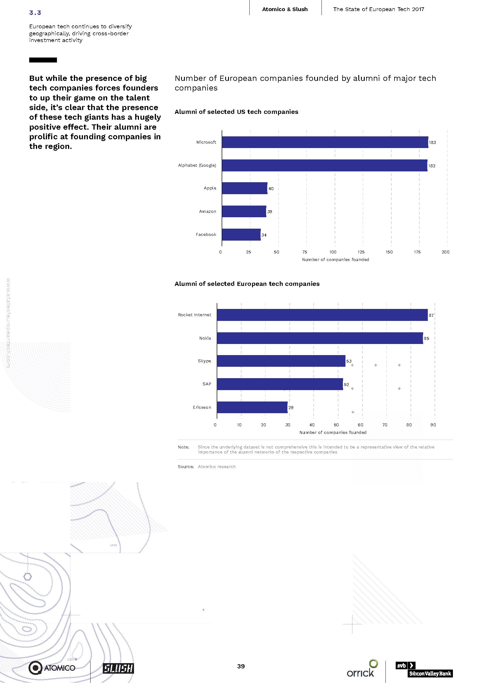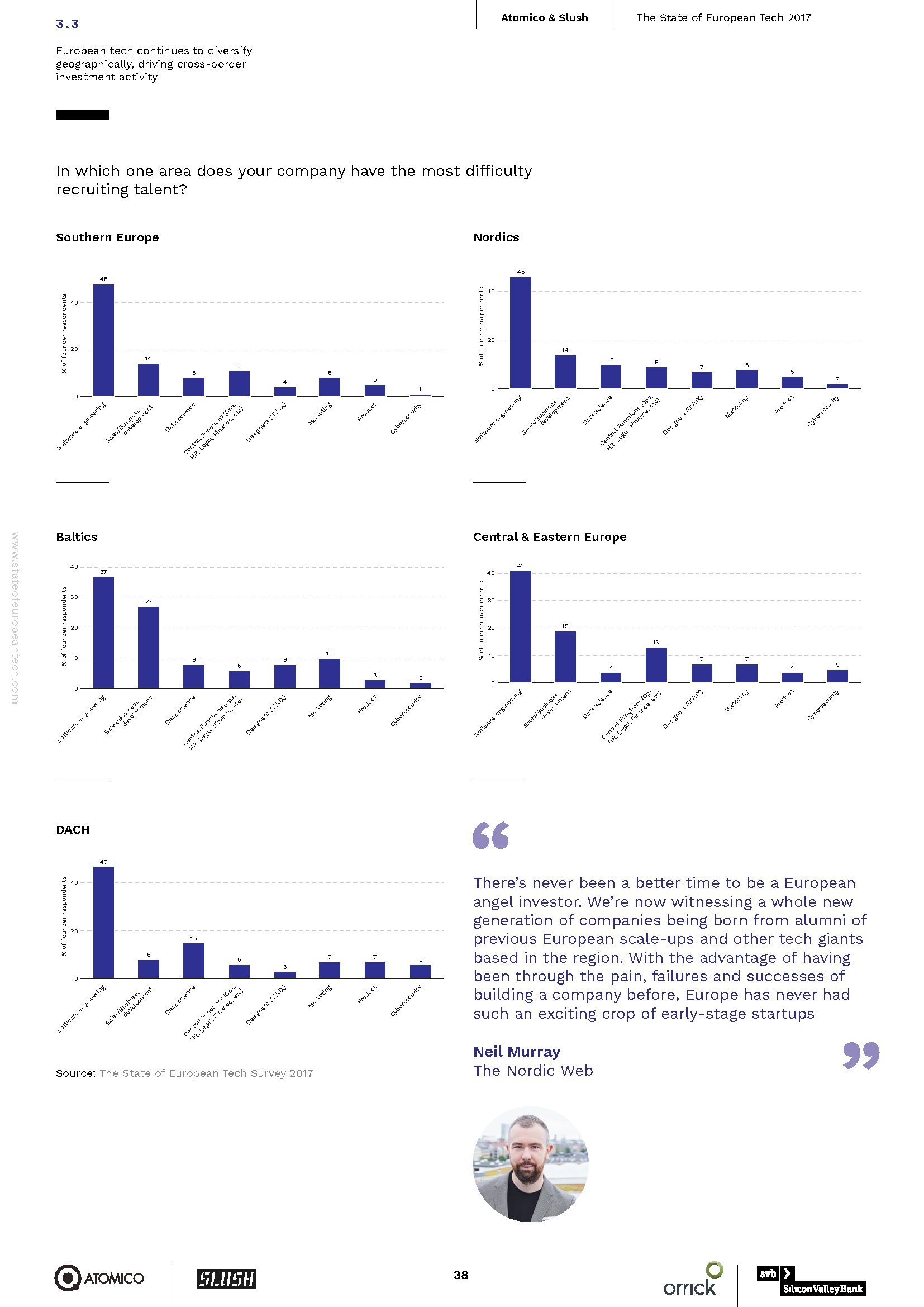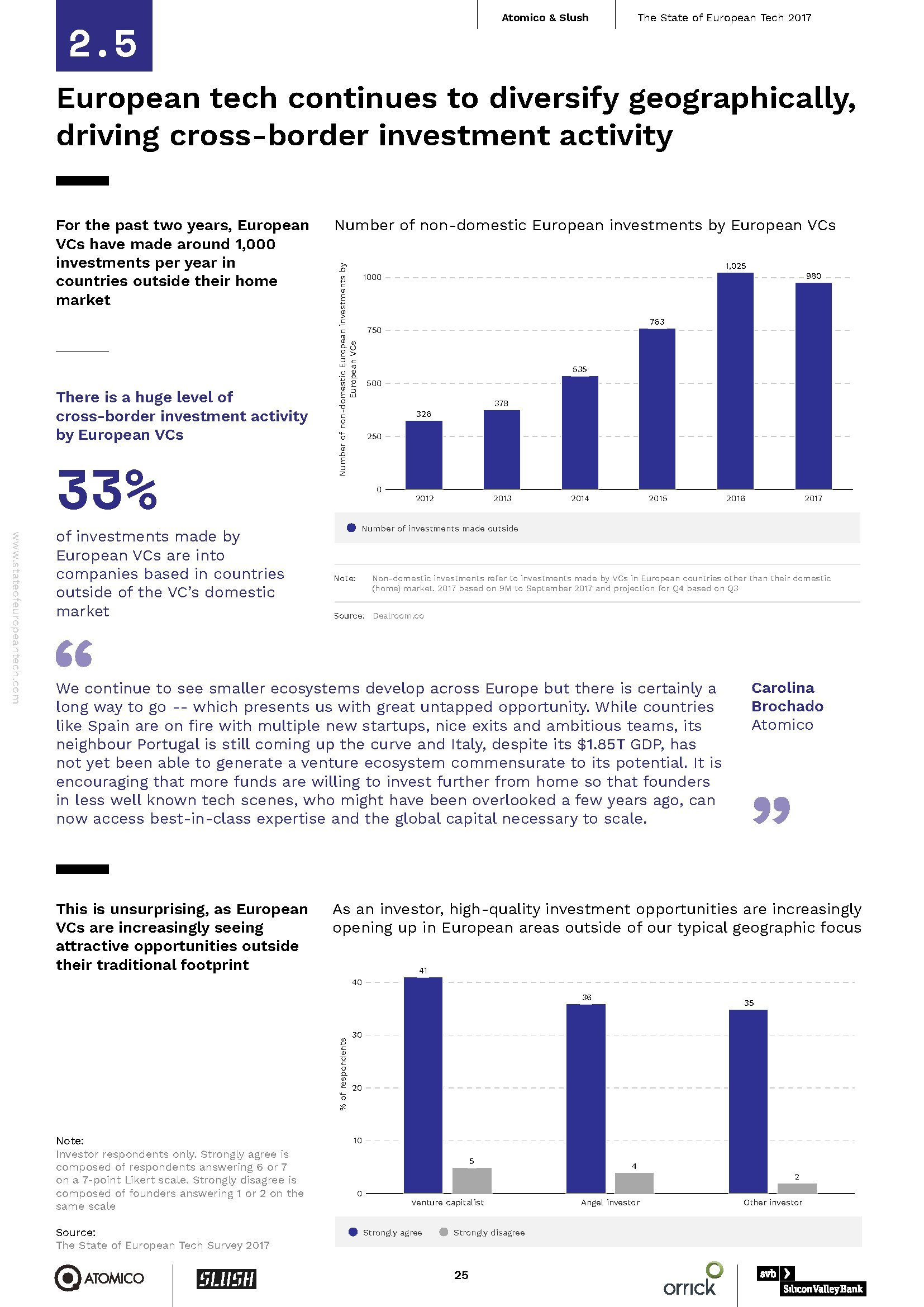 当然,社会问题也在影响欧洲科技界。例如,43%的欧洲天使投资人认为,社会和种族对他们的投资决策中起着至关重要的作用。同时,欧洲科技行业继续推动地域多元化和跨境投资活动,2017年,33%的欧洲风险投资发起的交易是投向了非本国企业。