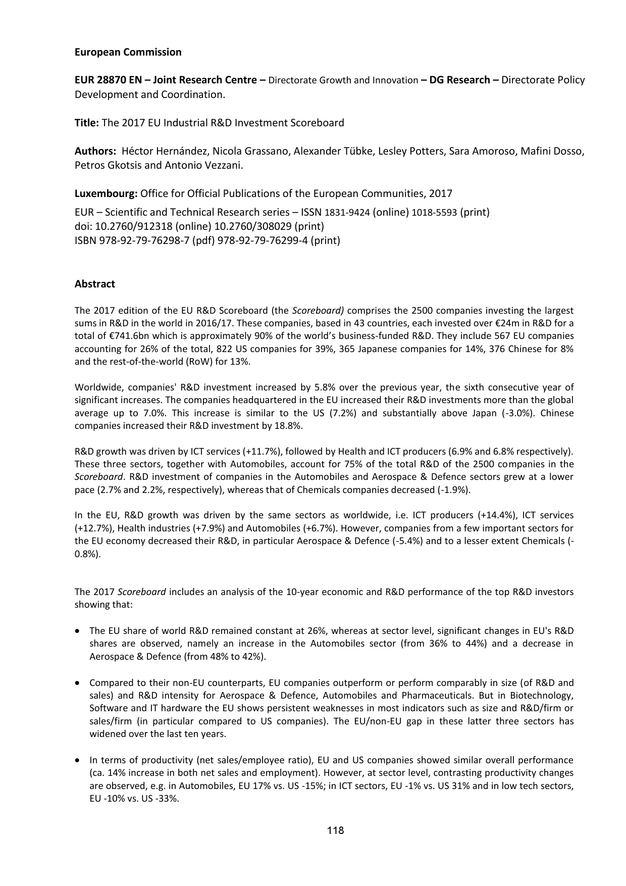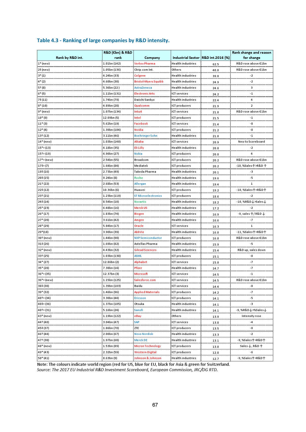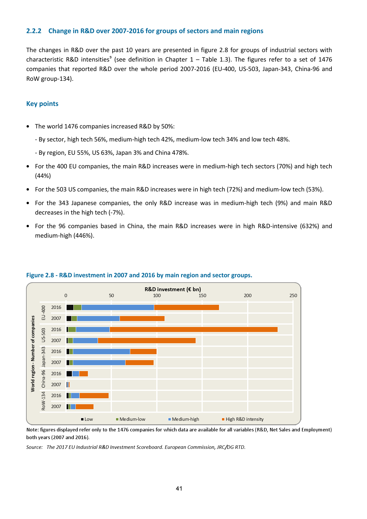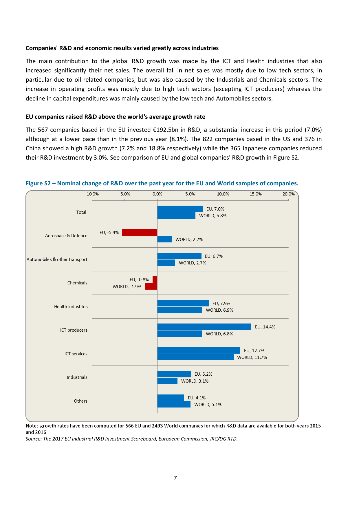 这2500家企业来自43个国家和地区,2016年它们的研发投资总额比上年增加5.8%,达到7416亿欧元,占全球所有企业研发投资总额的约90%。整体来看,全球企业研发投资增幅主要由信息通信技术领域推动。