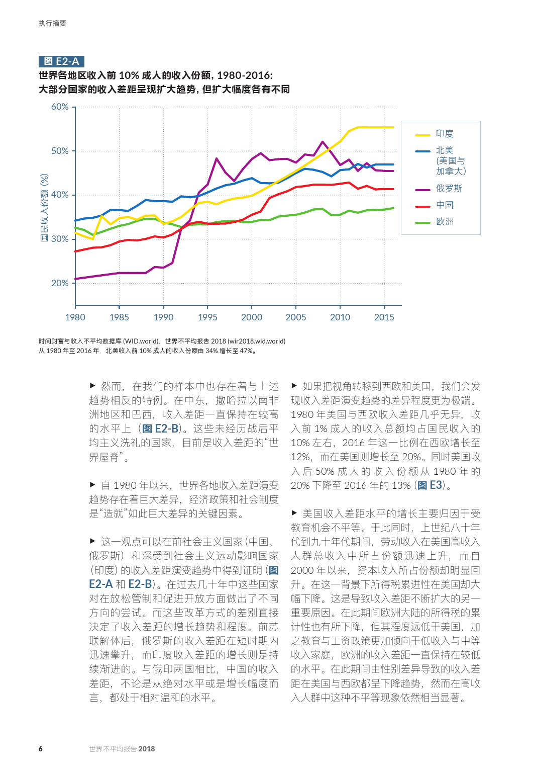 与此同时,1980年至2016年几乎全球所有国家居民收入差距以不同的速度在拉大。1980年以来,北美、中国、印度和俄罗斯居民收入不平等增长最快,欧洲的增长出于中等水平。中东、印度和巴西的增长水平没有提到,这些国家即使是研究周期的初期,收入分化水平就很高。
