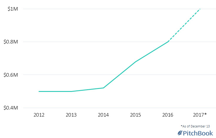 PitchBook数据显示,2012年的A轮投资的中位数为280万美元,2017年A轮投资中位数达到610万美元,这比2016年平均交易规模增长23%。