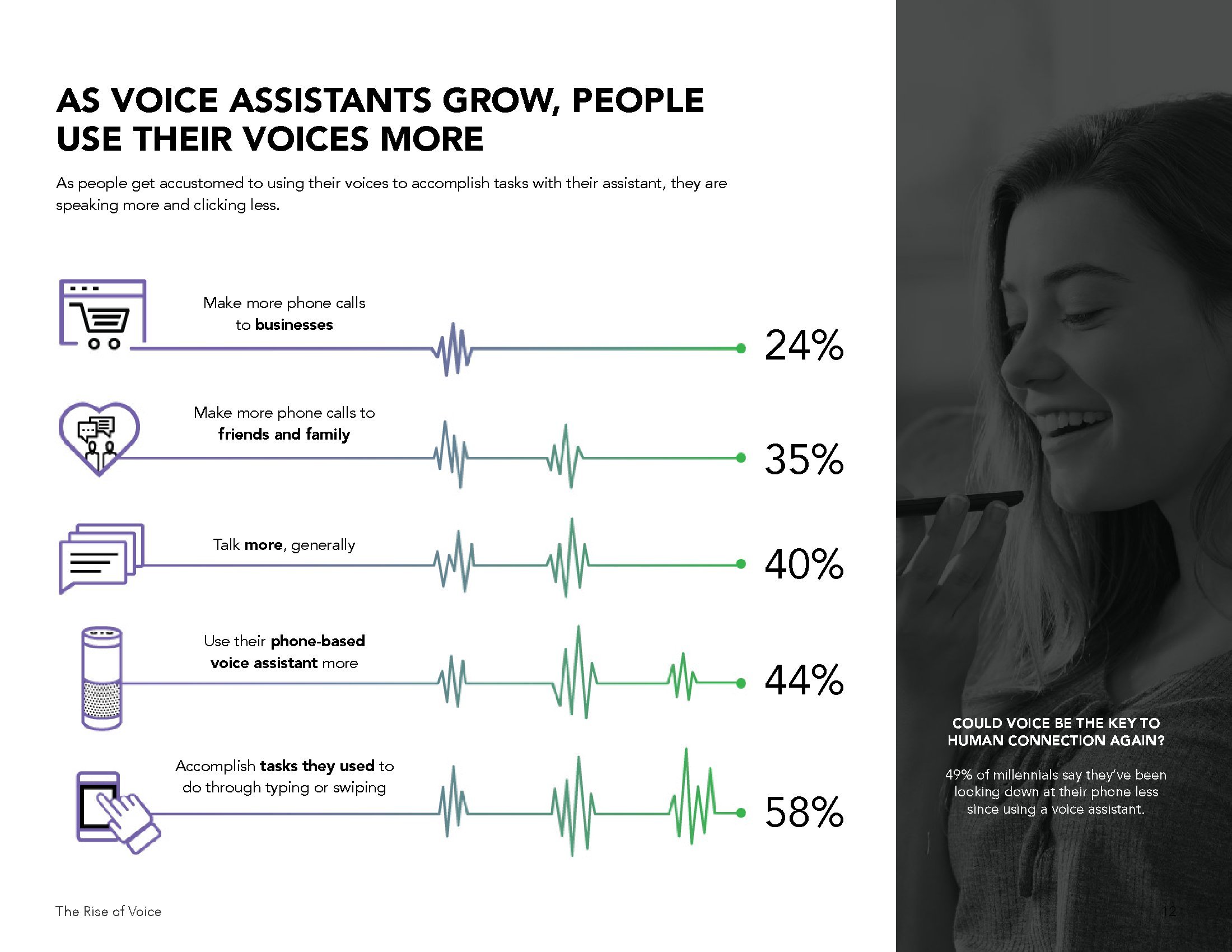 语音还有助于改善手机上瘾。一半的千禧一代受访者表示,自从使用语音助手,他们看电话的频率有所下降。