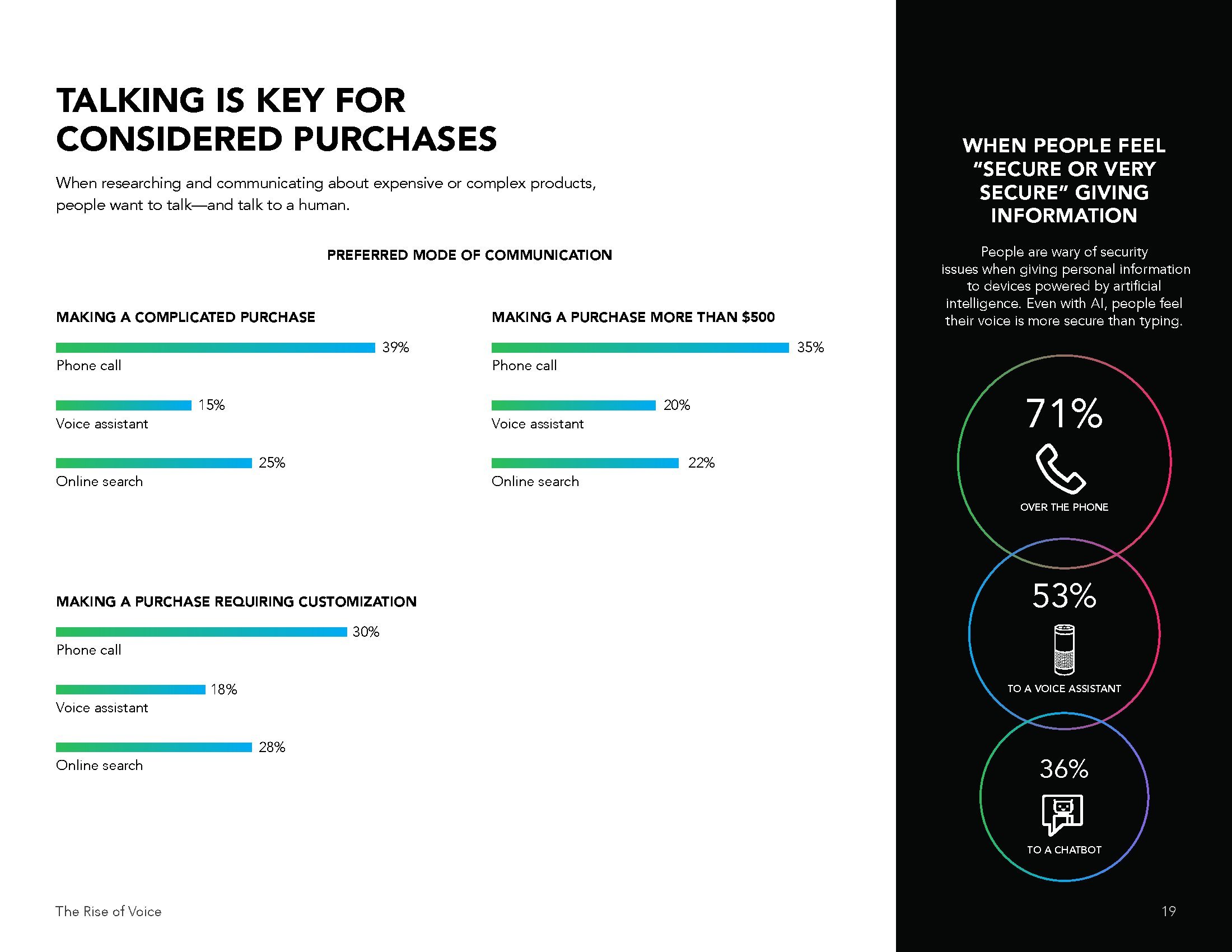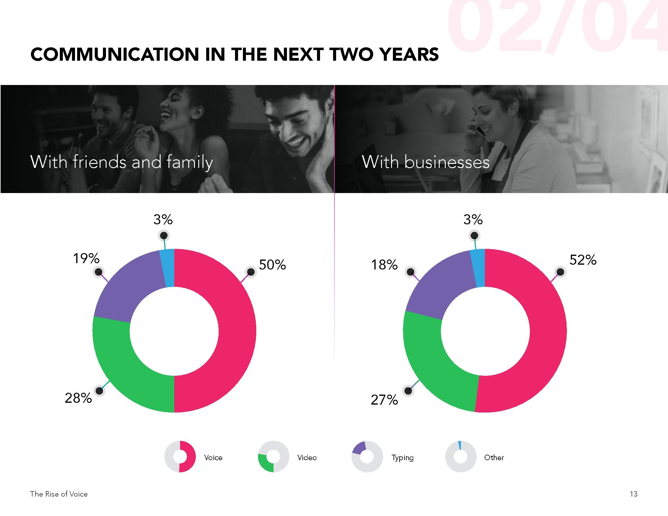 随着舒适度的提高,人们通常会更愿意使用语音交流,58%的受访者通过打字或滑动来完成他们经常做的事情,44%的受访者使用电话上的语音助手,40%更多地使用语音。