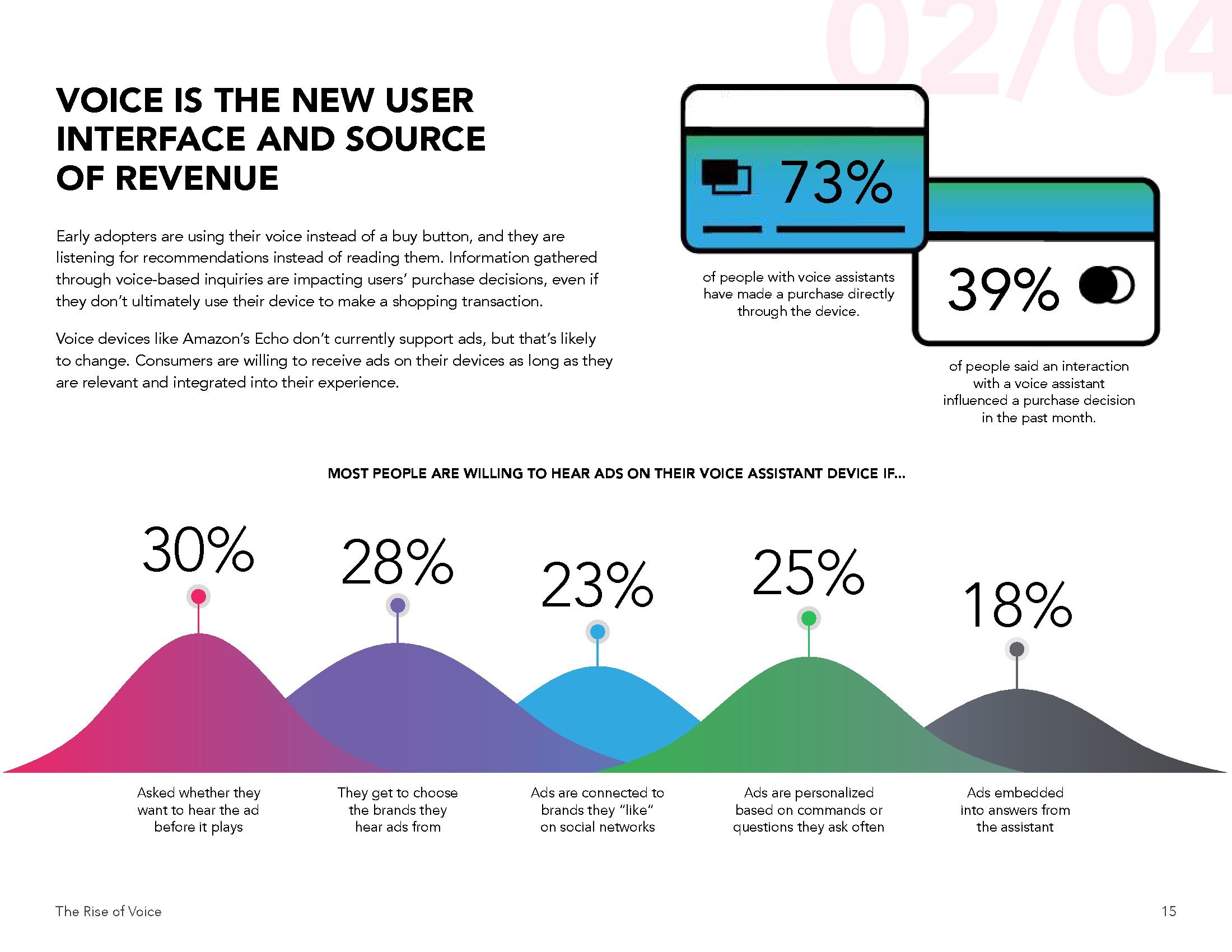 Invoca的研究显示,1/5的谷歌搜索是基于语音的,而这个数字到2020年将达到50%。3/4的用户直接通过语音助手购买商品;39%的受访者表示,语音助理影响了上一次购买决策。