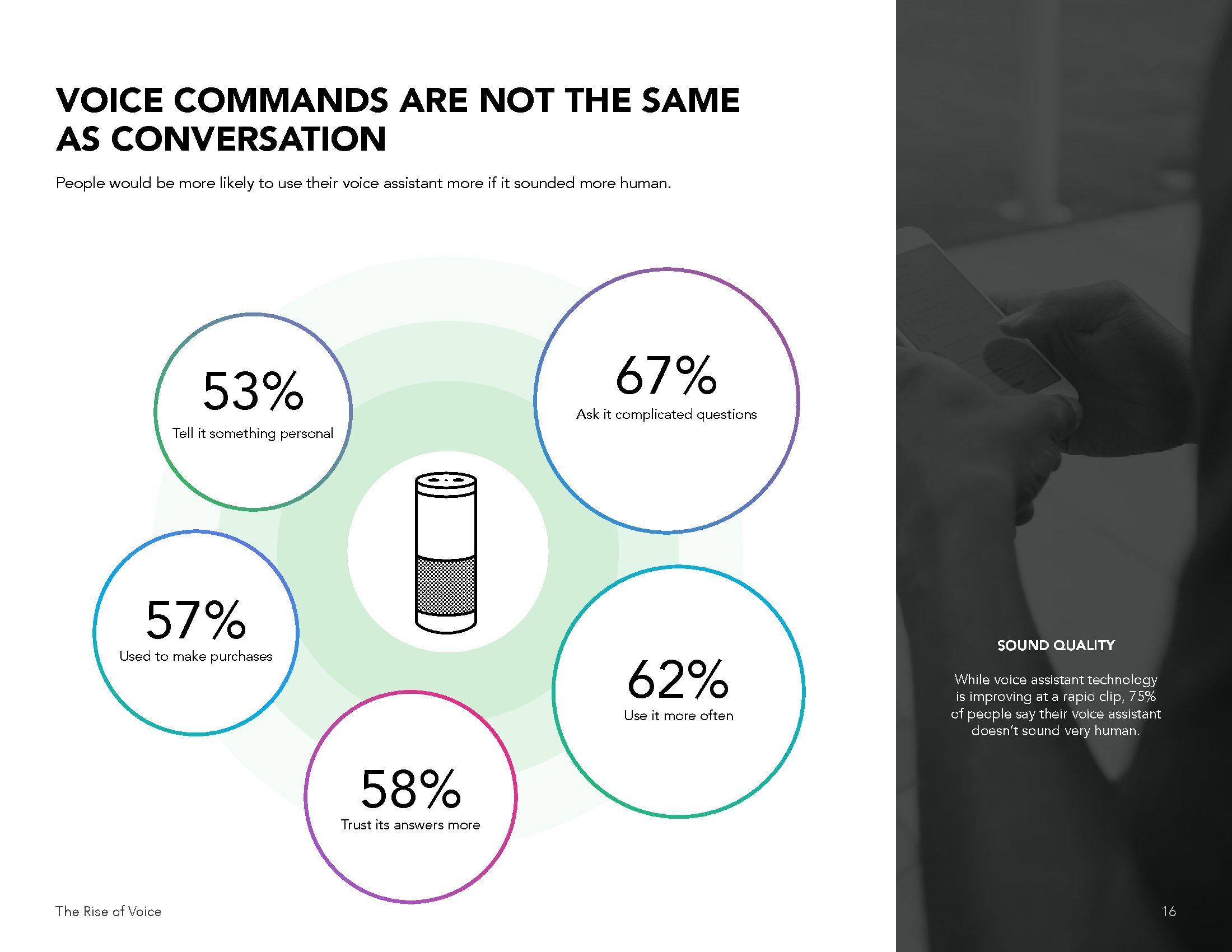 语音助手还有很大增长空间,62%的受访者表示,如果语音助手听起来更人性化,他们会更频繁地使用。目前,3/4的消费者认为他们的语音助手听起来不太人性化。