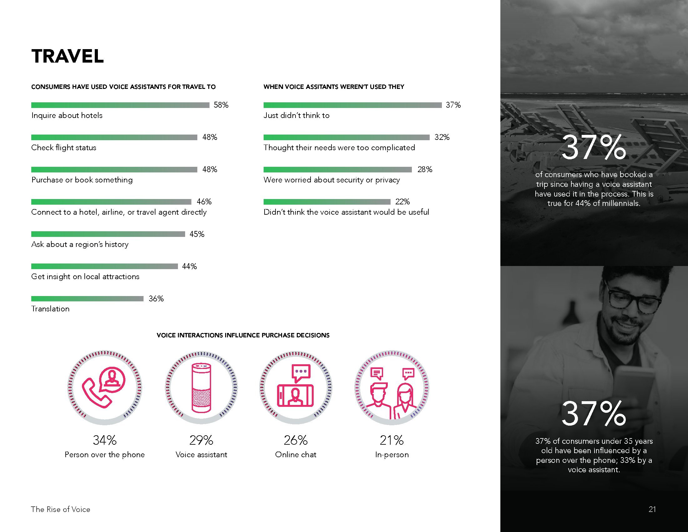 旅游业:拥有语音助手的消费者主要用它们来查询酒店(58%)。语音助手在购买旅游产品的过程中非常重要,37%的受访者使用语音助手预订过旅游,千禧一代依然是前沿(44%)。