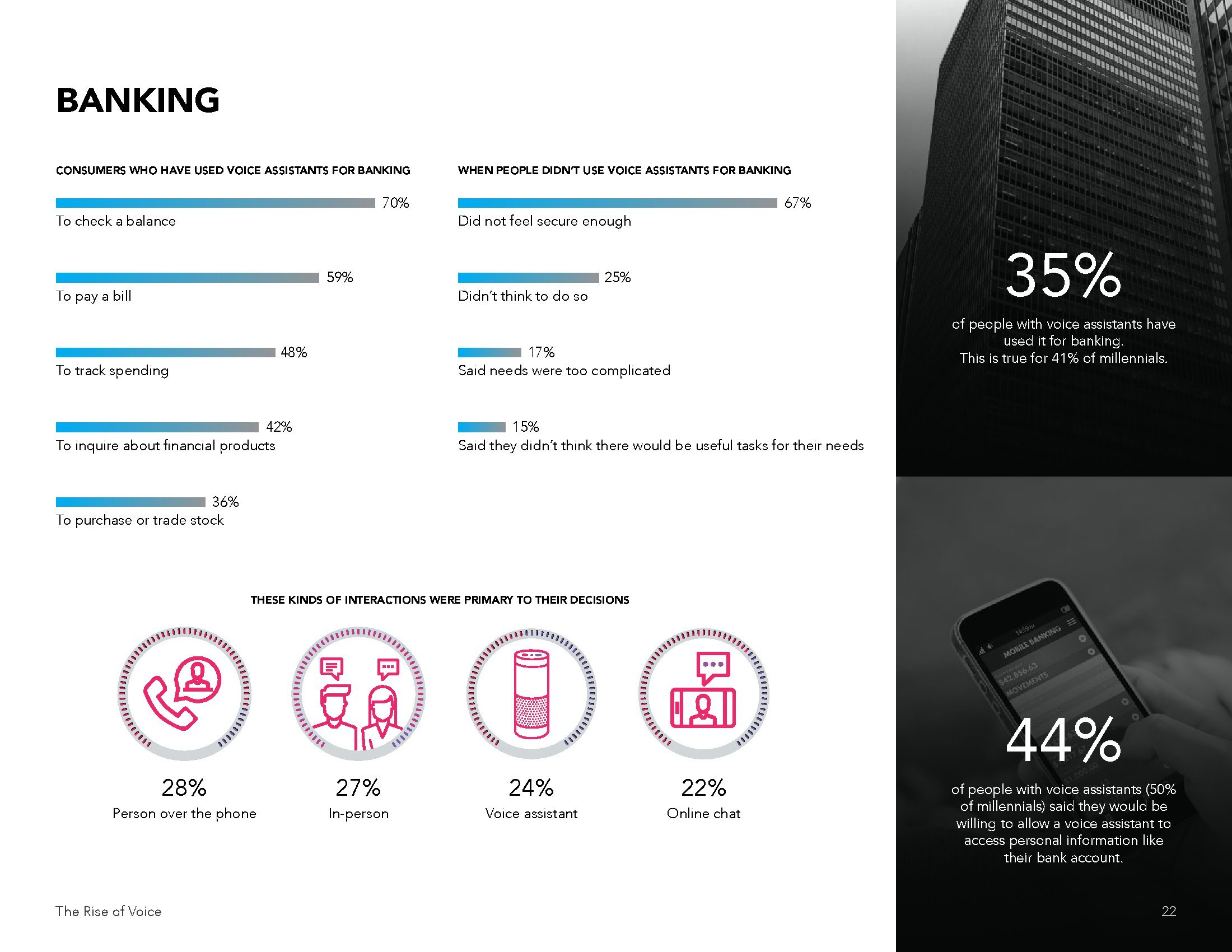 银行业:1/2的受访者在银行业务中使用语音助手,最常见的是查询余额(70%)和支付账单(59%),还有人购买和交易股票(36%)。