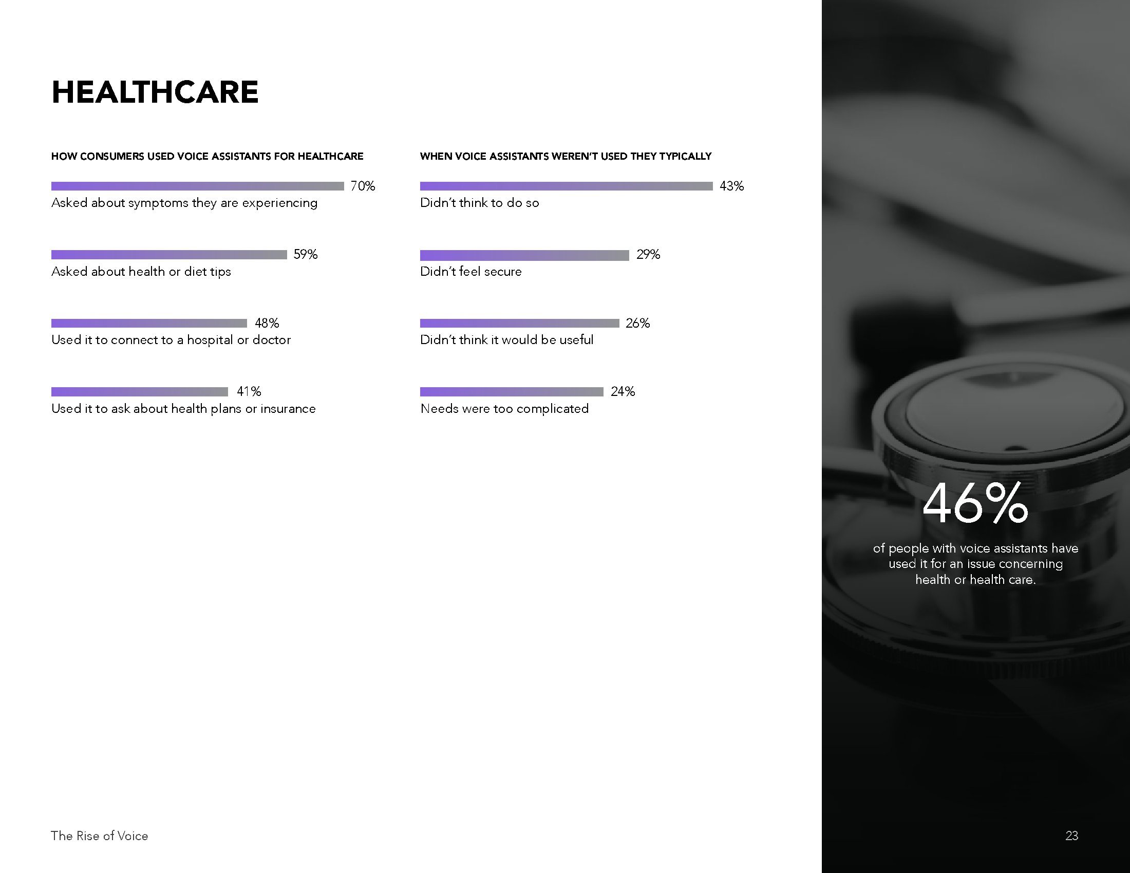 医疗保健:人们更愿意在这个领域使用语音助手(46%),最常用的是询问症状(70%)。