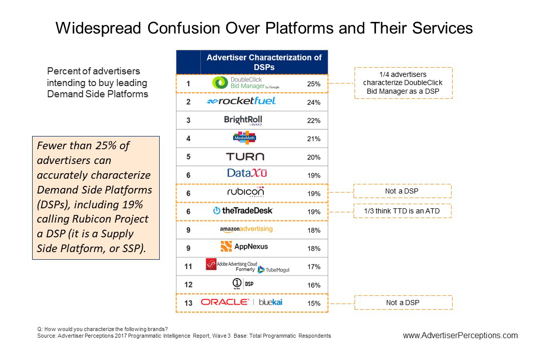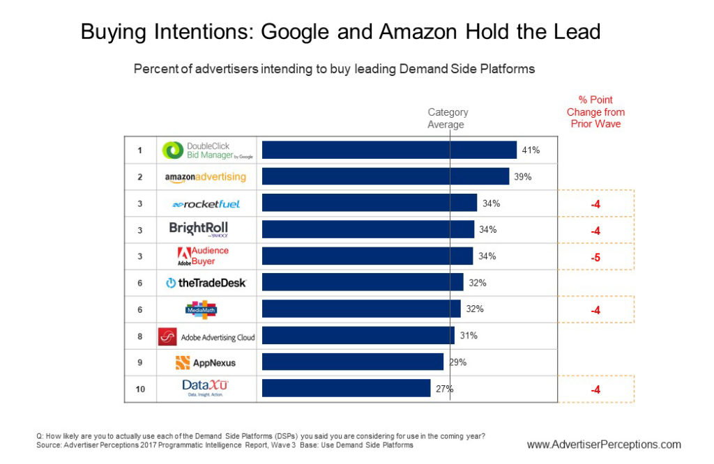 总的来说,80%的客户正在加快或优先考虑广告程序化购买。他们平均使用三个DSP(需求方平台)来积累受众。亚马逊仍然是最受欢迎的DSP,而亚马逊和谷歌(DoubleClick Bid Manager)仍然是使用量最大和购买意向最高的DSP 平台。广告商主要根据受众范围、广告分析的质量以及轻松合作等方面做出决策。谷歌被认为提供了最大的受众范围和最有价值的广告分析和数据,其次是亚马逊和Media Math,而亚马逊和The Trade Desk被认为是最容易合作的。