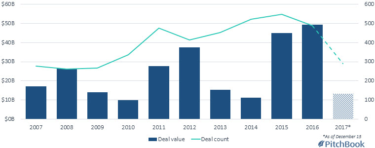 但是,PitchBook的数据显示清洁科技并购活动正在进入后衰退期。2016年,该行业并购交易488宗,成交额近500亿美元。而2017年则降至2009年的水平。