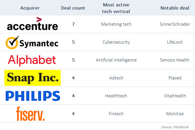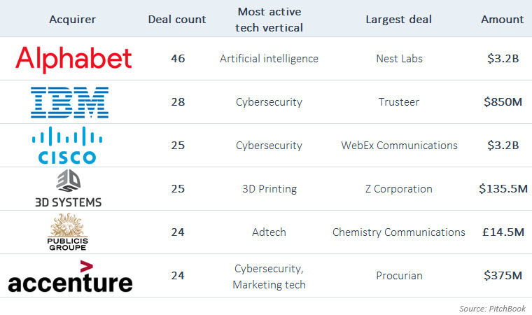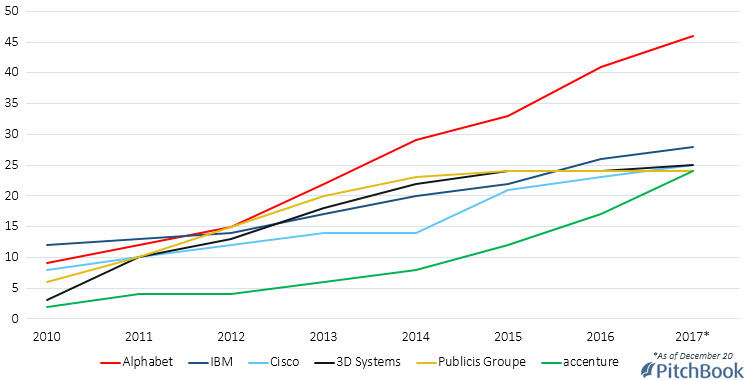 PitchBook的数据显示,企业试图通过收购来抵御颠覆。自2007年,近一半的新兴科技买家来自IT行业。 Alphabet、IBM和思科每年至少完成一宗收购交易,此外,3D Systems和Publicis Groupe并购交易数量也稳居前六位。