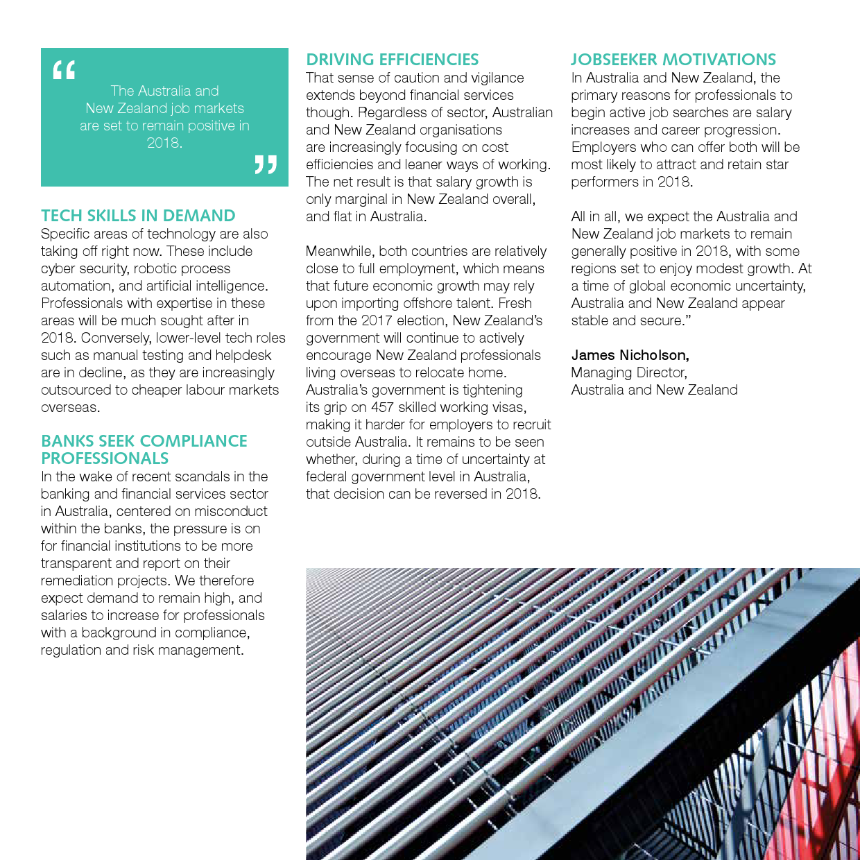 随着中国逐步朝“工业4.0”方向迈进,中国的工业和制造业将会继续成长。企业希望优化流程、丰富生产、提高产量,因此需要高级专业人才充实运营、销售、质量和设备维护等岗位。越来越多的研发中心正在中国兴建,旨在推动创新,高效地开发新产品。此外,生命科学和制药行业也会需要大量精于研发、技术和销售的专业人才。由于行业缺乏拥有适当技能的求职者,因此薪资会有所上涨。