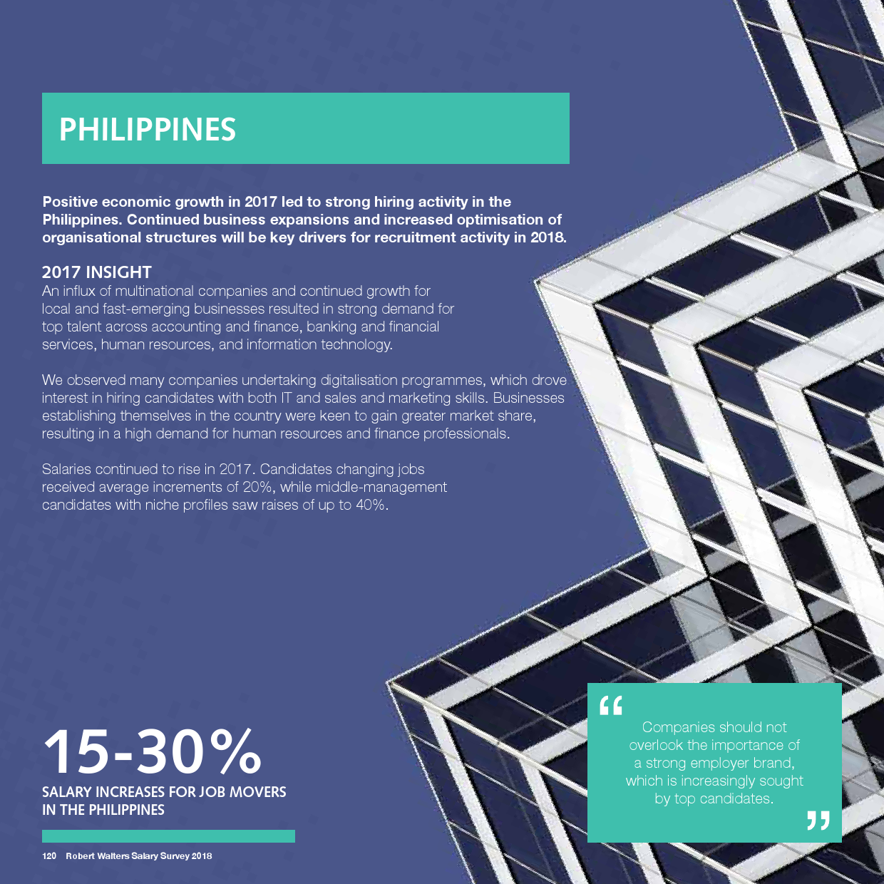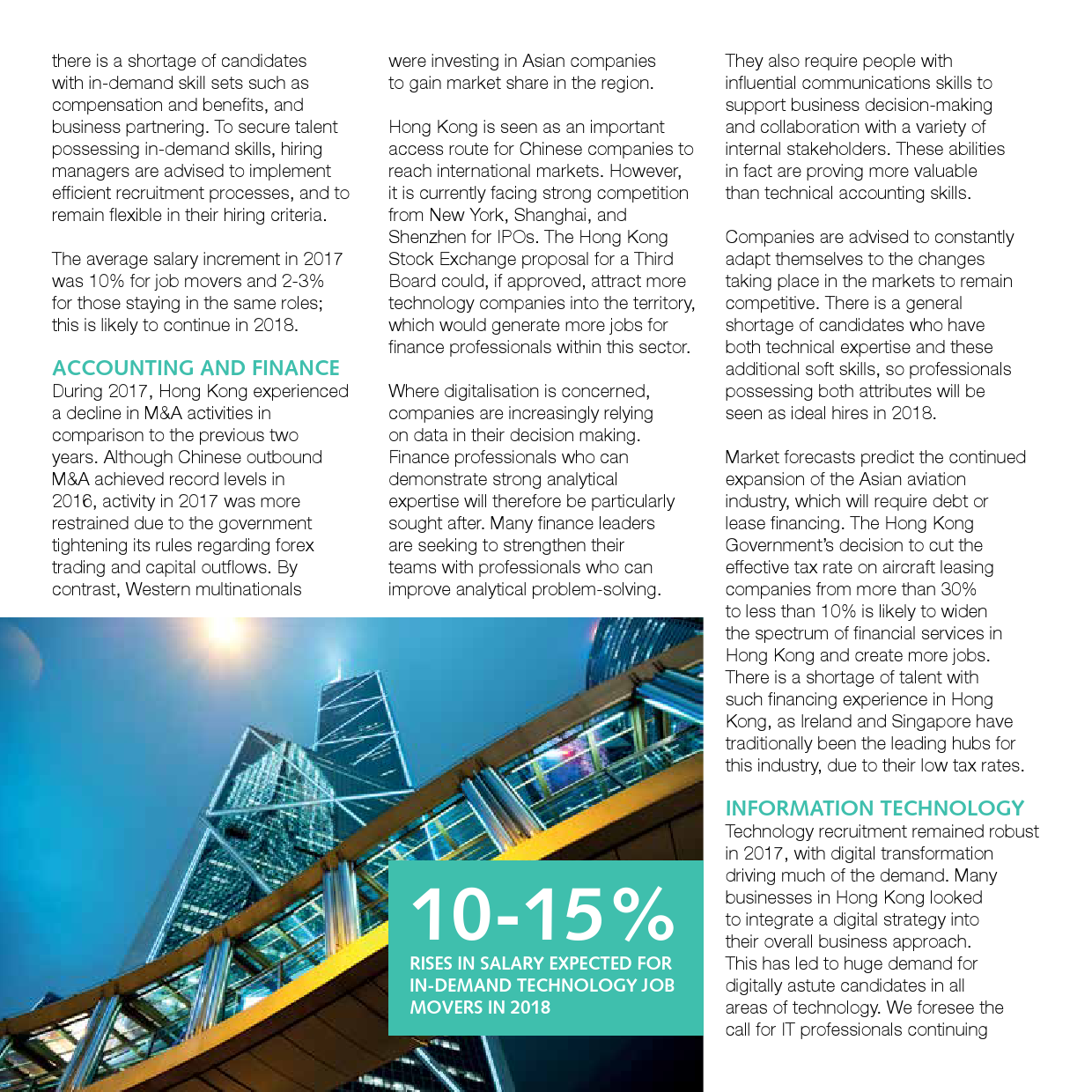 中国的“互联网+”战略将使众多领域对IT专业人才的需求继续维持现有的上升态势。我们预计,由于在线支付和移动支付解决方案与金融科技发展迅速,2018年中国市场对自动化服务应用领域拥有专业技能的人才会有特别大的需求,包括在线支付技术以及开发具备运行稳健的电商平台的优化级网站。具备良好商业意识的人才也将备受追捧。