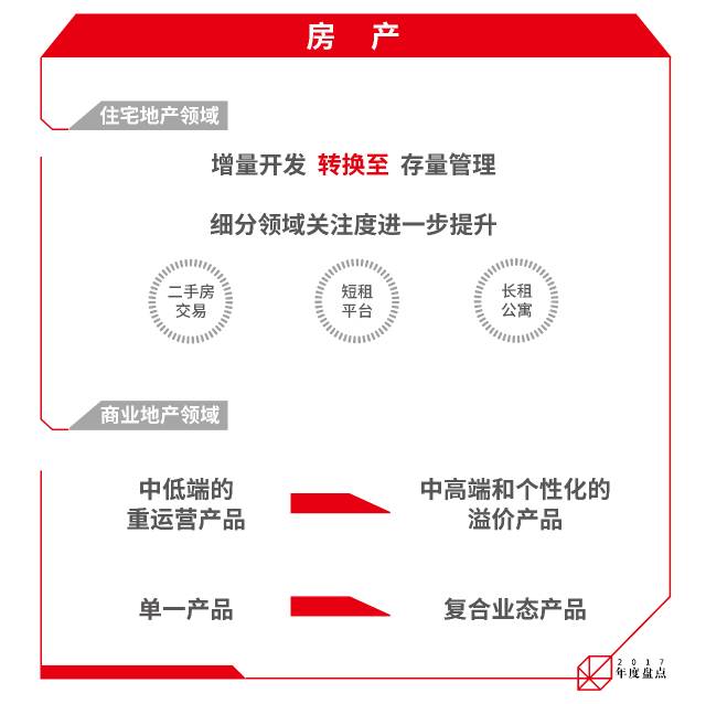 - 住宅地产领域,从增量开发到存量管理的转换趋势愈发明显,二手房交易、短租平台及长租公寓等资产管理细分领域关注度进一步提升。尤其是长租公寓行业,在消费升级大潮和各地租售同权的政策驱动下,成为2017年最大的风口,地产开发商、酒店运营商、房产经纪、创业者等各种背景的玩家纷纷进入市场,快速跑马圈地。多家长租公寓企业会陆续完成大额融资。