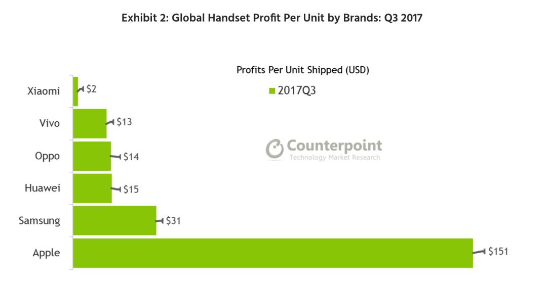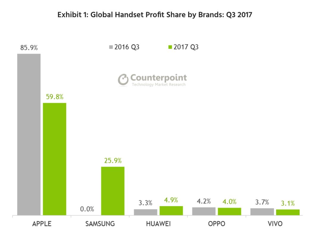 手机利润排名第二的依然是三星,不过三星是三季度的大赢家,Galaxy Note 8表现非常强势,三星的利润市场份额也达到了26%。值得一提的是,2016年三星因为遭遇了Note 7电池爆燃的事件,利润占比曾一度跌到了0.1%。据了解,除了Note 8,三星S8的销售情况也不错。