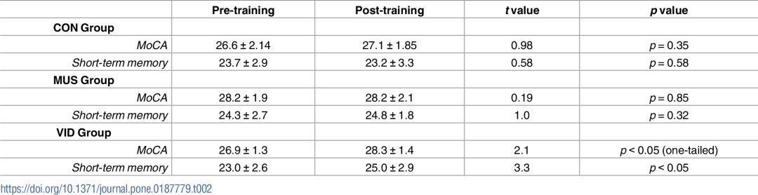 6个月后,研究发现,只有VID训练组的受试者,海马体内灰质是显著增加的(与在年轻成年人中观察的结果一致);MUS训练组的受试者DLPFC的增加,而VID和MUS训练都导致了小脑的增长。相反,CON训练组的受试者,海马体、小脑和DLPFC都有显著的灰质减少。
