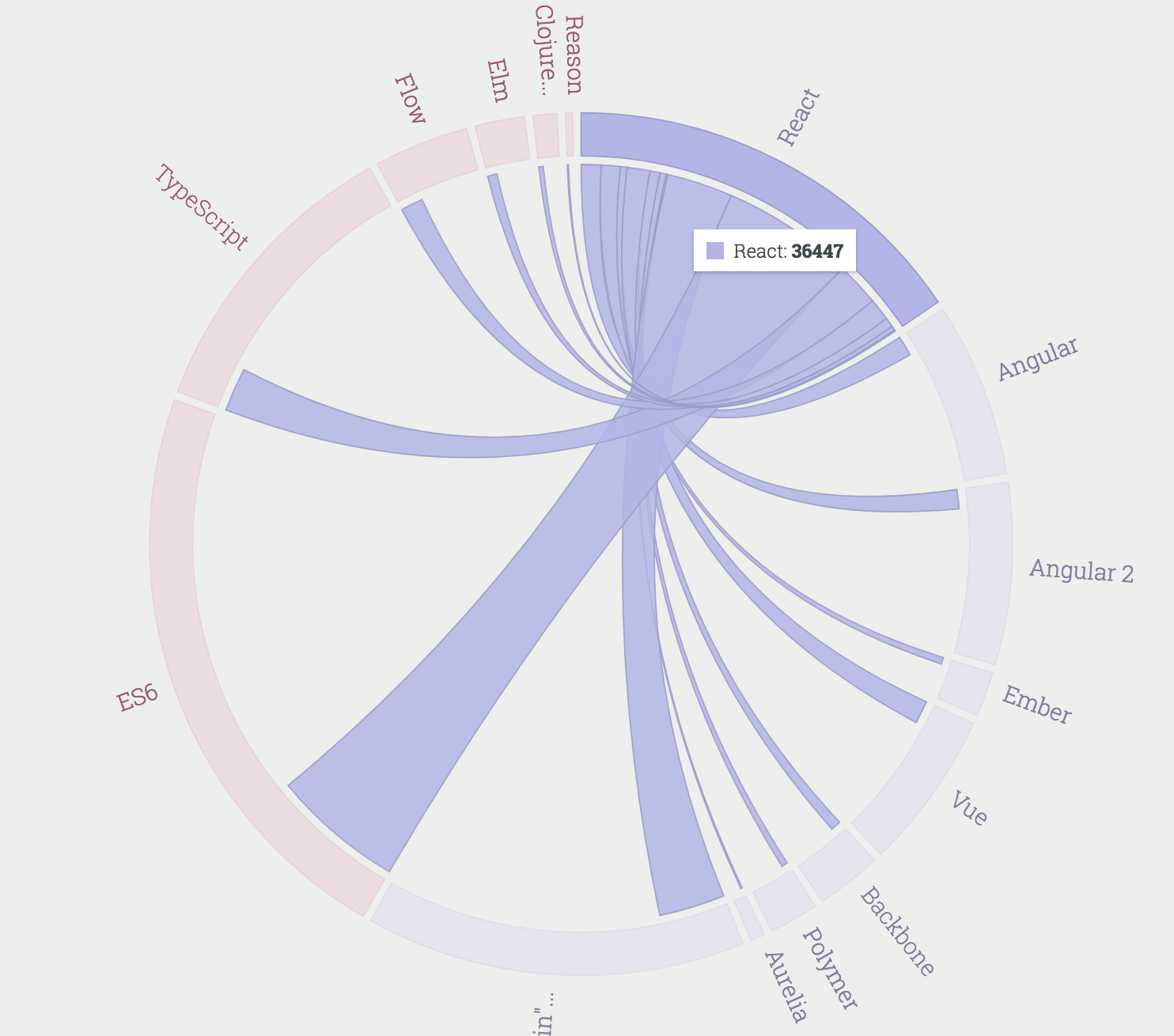 在今年的报告当中,报告团队提供了一个“连接”视图,读者可以在一张可交互的图表上查看数据细节。例如,如果读者选择了“JavaScript Flavors”(如ES6、TypeScript、Flow等)和“Front-End Frameworks”(如React、Angular、Angular 2等),那么就可以看到同时使用React和TypeScript的开发者要比同时使用React和Flow的开发者多。我们还可以看到超过4300个开发者在使用微软的TypeScript,而使用Facebook Flow的只有2200个。从这张图表中可以查看各种各样的组合数据。