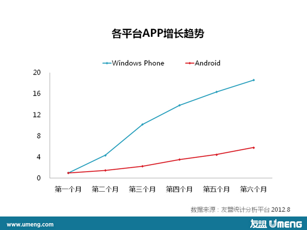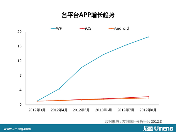 对比历史数据,可以从另一个角度看出Windows Phone APP增长势头之迅猛。2010年8月,友盟Android统计功能上线,此后6个月,友盟覆盖的Android APP增长至最初的6倍。而友盟Windows Phone统计功能2012年1月上线后,友盟覆盖的Windows Phone APP 6个月后增长至最初的19倍,这样看来,Windows Phone APP的开发者似乎更有热情。