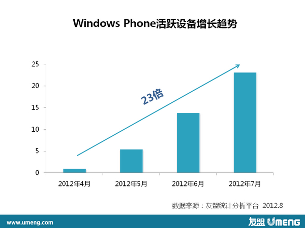 对比Android 和iOS 设备发展的初期, 2010年10月至2011年4月期间,友盟平台覆盖的iOS & Android活跃设备增长了3倍,应用启动次数增长了5倍。由此可知Windows Phone平台的增长速度确实是惊人的。