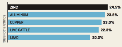 在大宗商品所有大类之中,今年(以锌为首的)金属交易价上涨最快,主要因为中国的工业需求增长强劲。