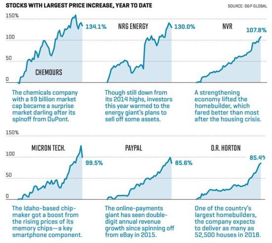 对一小部分公司和投资者来说,今年非常棒。图中是2017年美股市场涨幅最高的大公司。