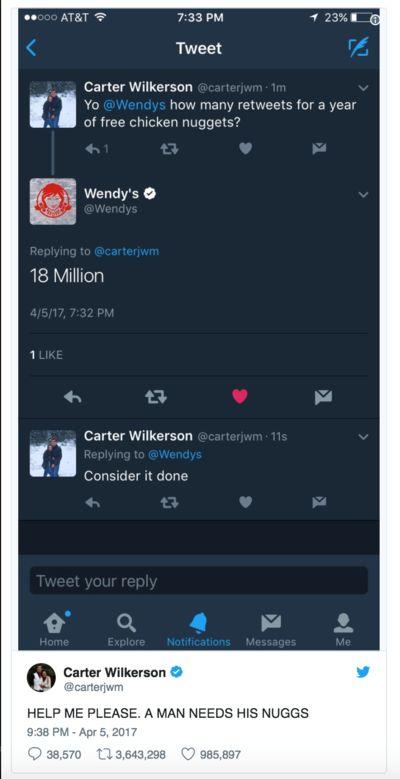 @Wendys称,只要卡特·维尔克森在Twitter求鸡块的推文转发达到1800万次,就免费提供一年的鸡块。