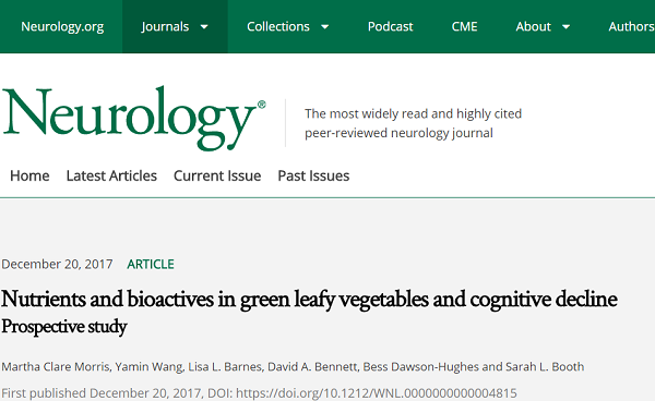 12月20日,发表在Neurology杂志上的这项研究中,来自美国拉什大学的一个科学家小组发现,当认知能力随着年龄的增长自然衰退时,每天吃一份绿叶蔬菜(eating one serving of leafy green vegetables a day)可能有助于保留记忆和思考能力。