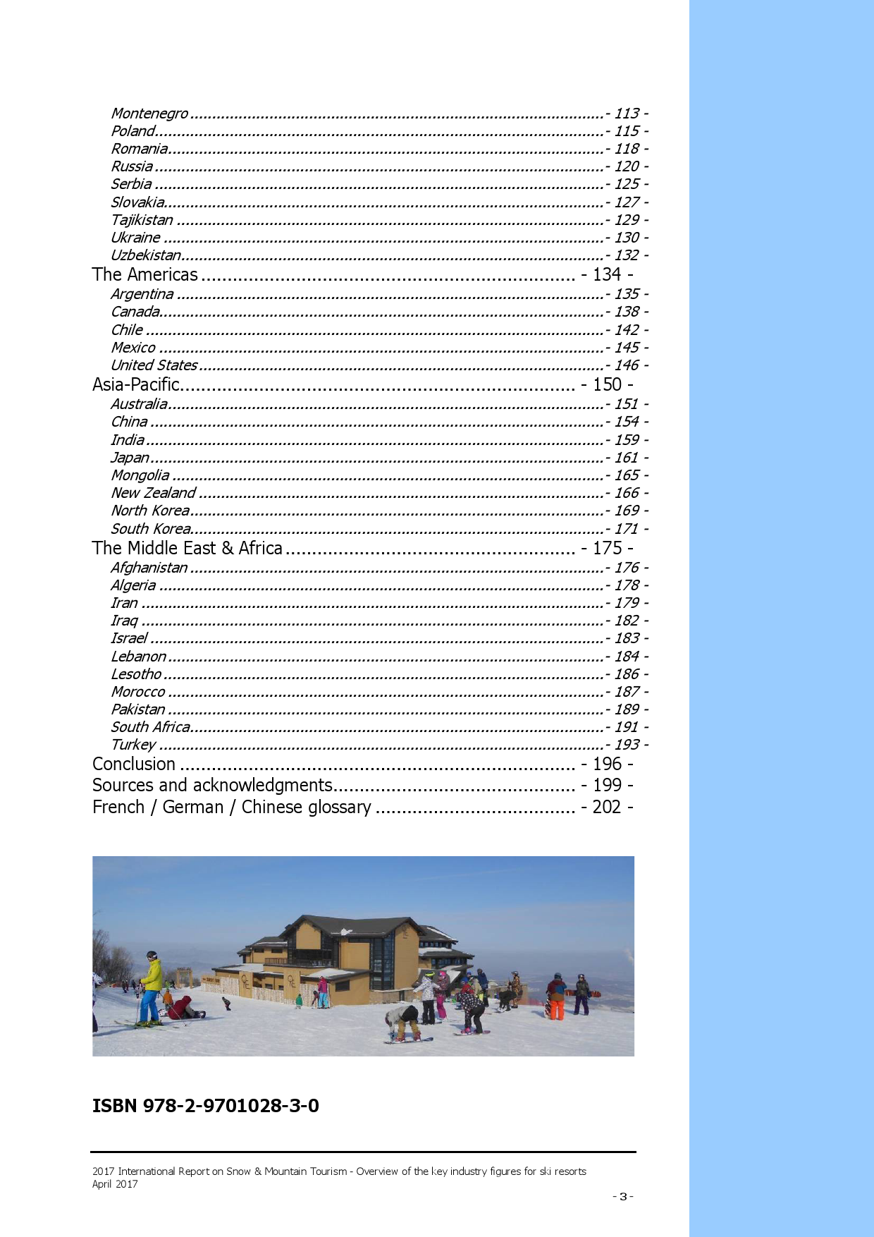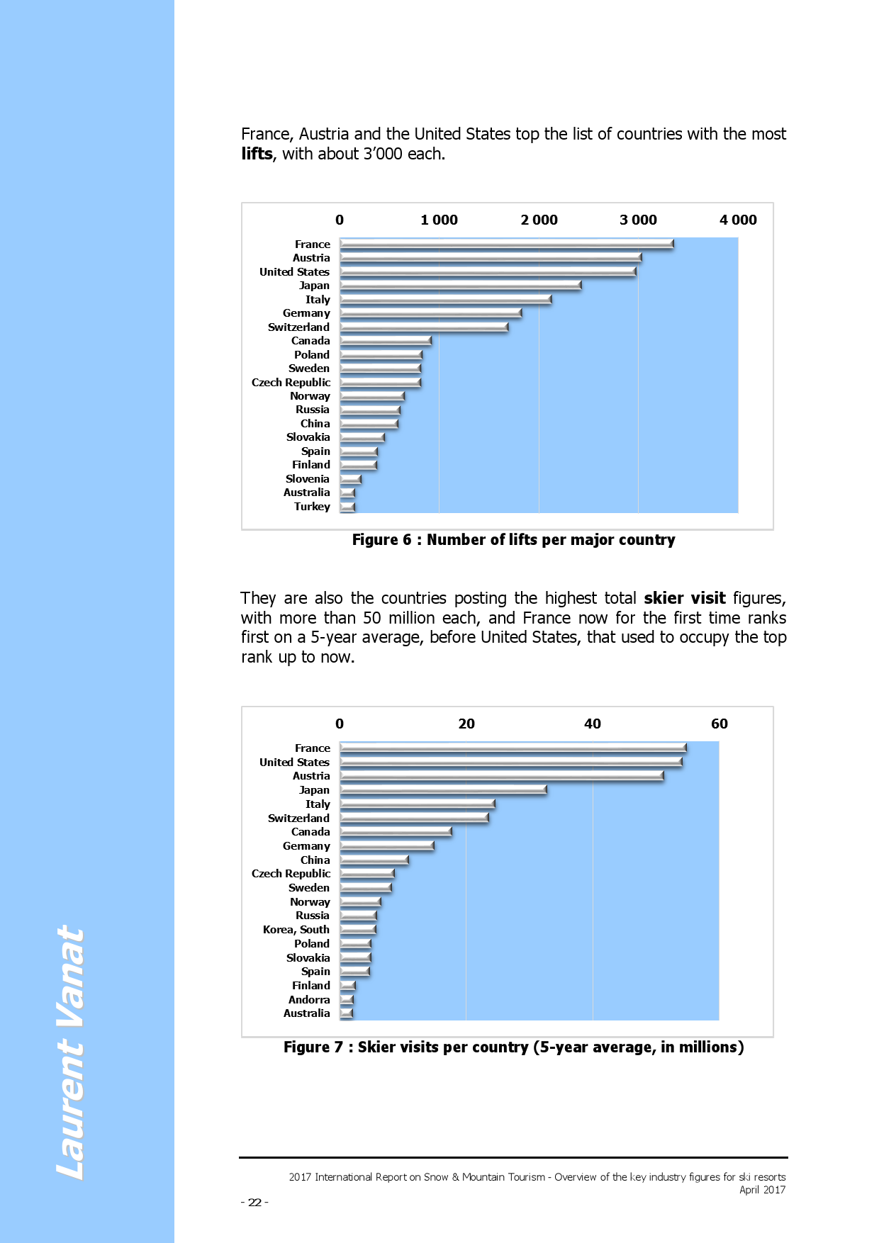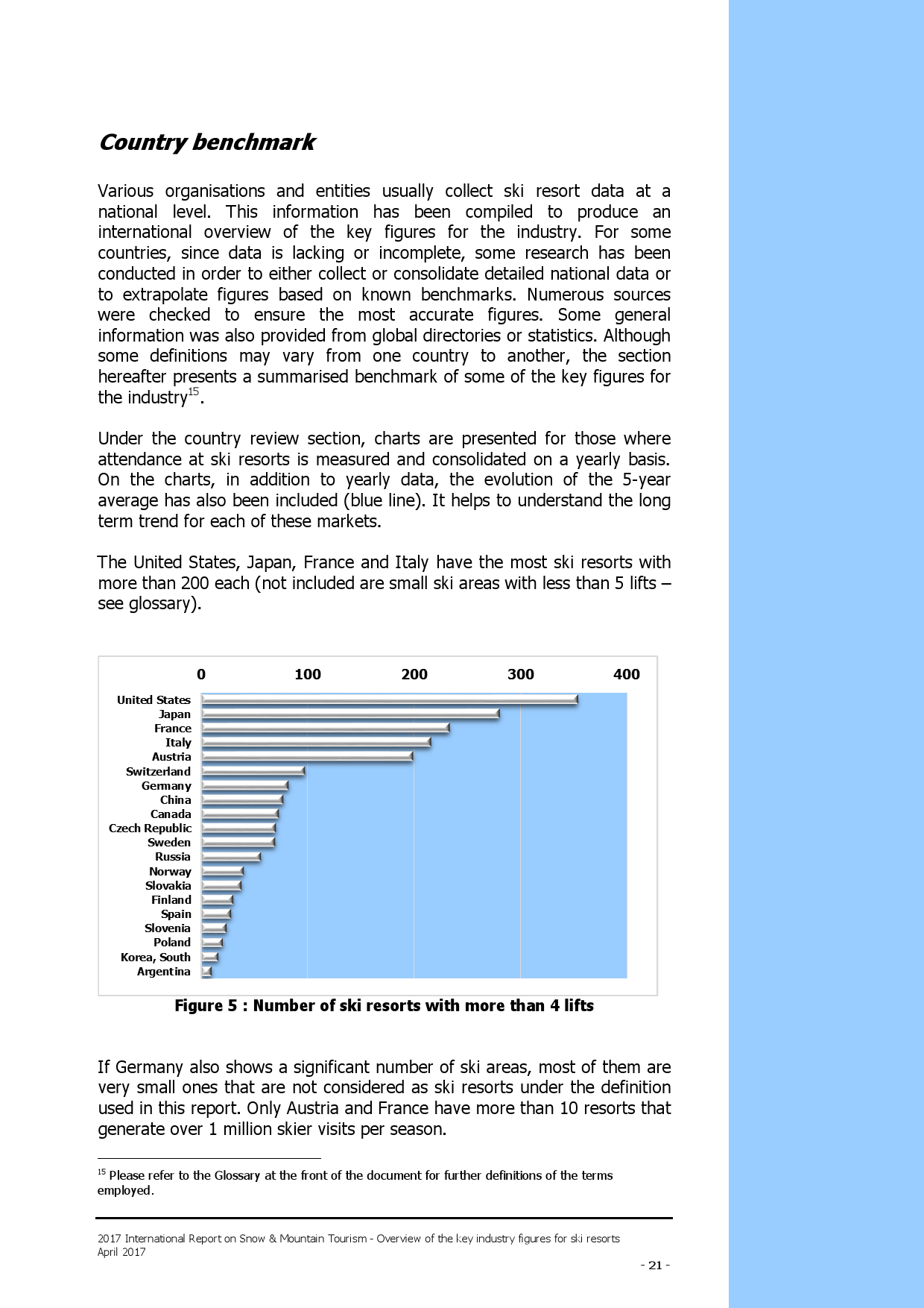 在拥有至少5条索道的中大型雪场数量方面,美国,日本,法国和意大利为最多的四个国家,均超过200个。