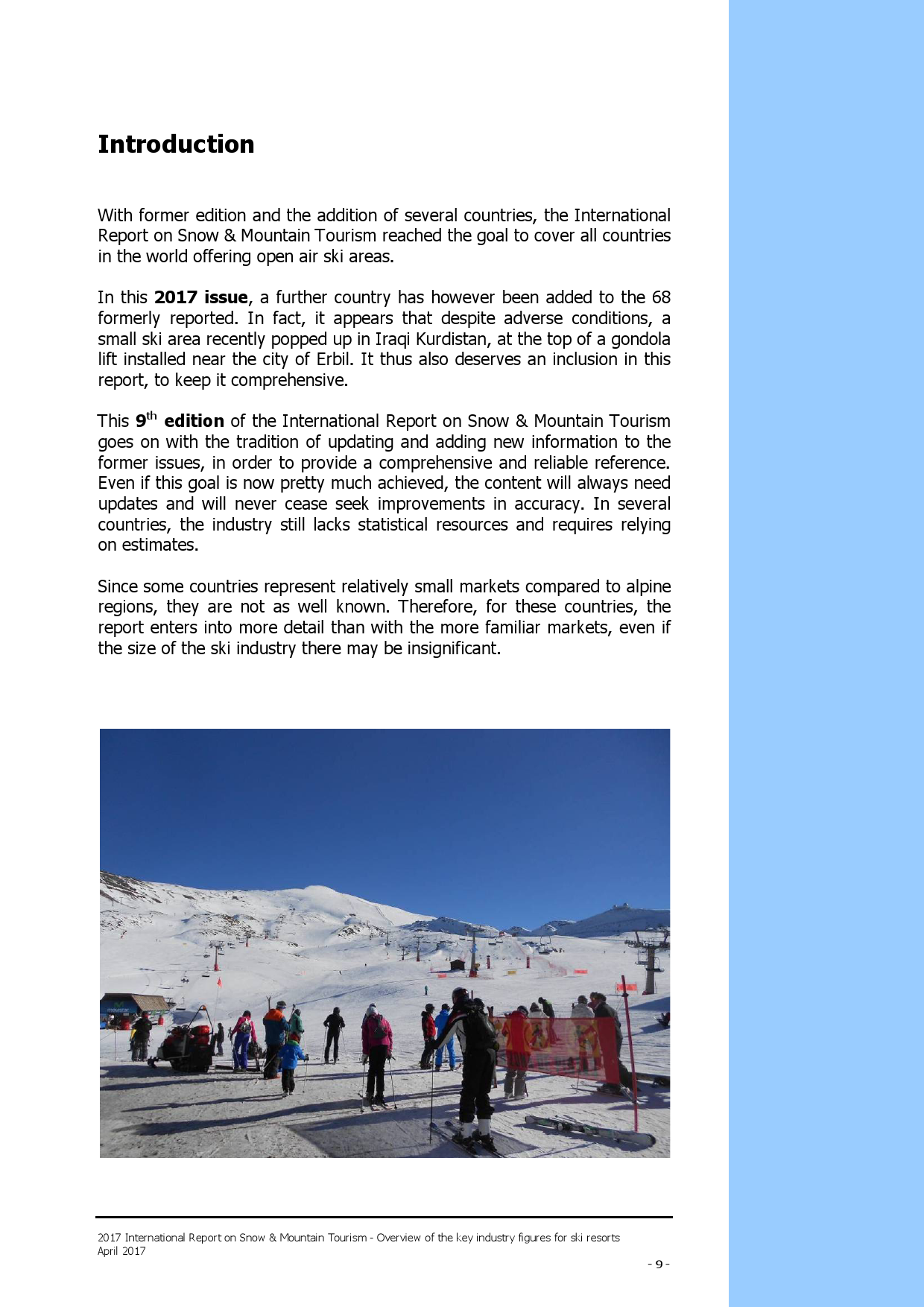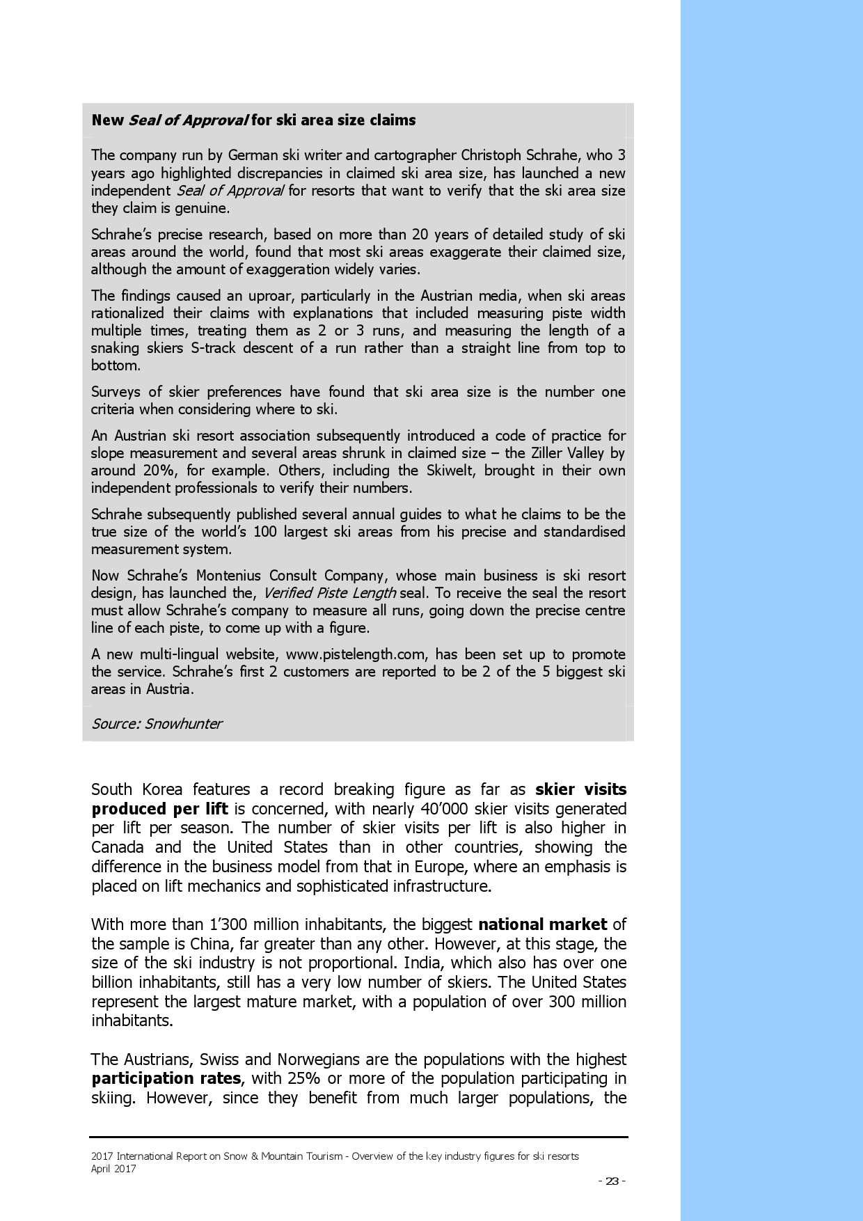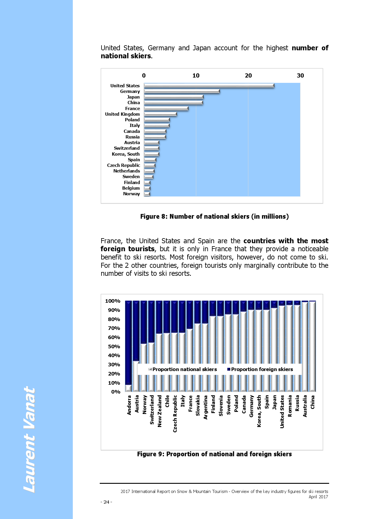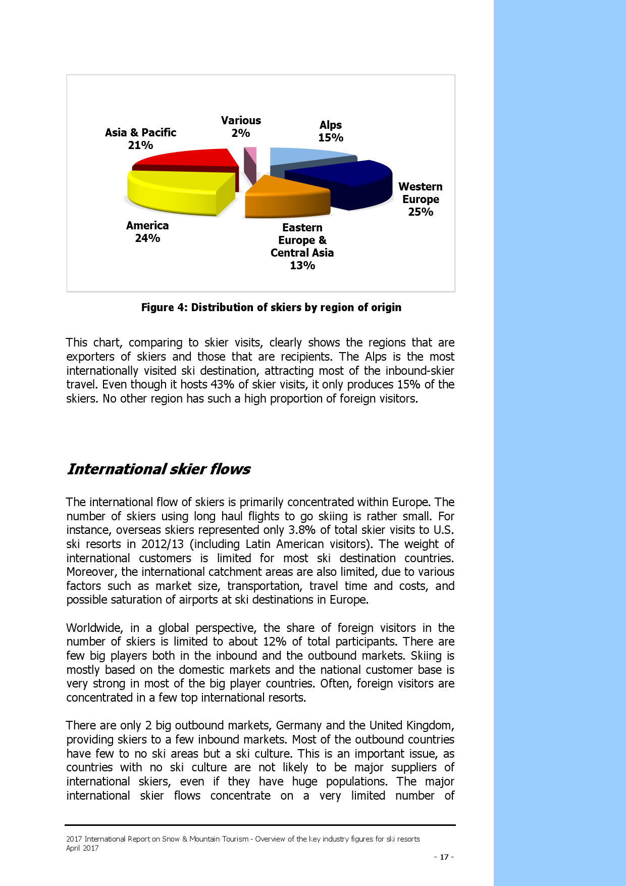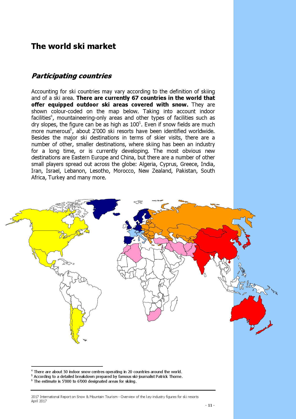 奥地利,瑞士,挪威有超过25%的国民参加到滑雪运动中。是世界上比例最高的三个国家。单从人数来看,美国,德国和日本是参与滑雪人数最多的三个国家。除了安道尔和奥地利,所有国家的滑雪者都主要来自国内。