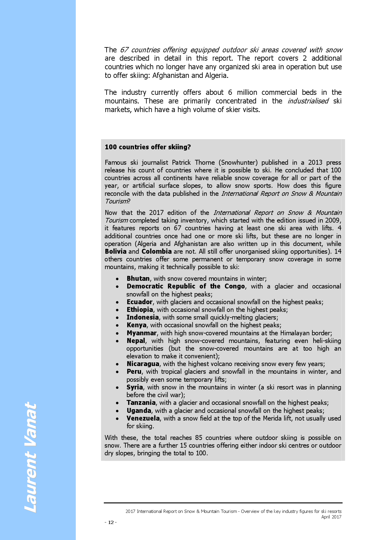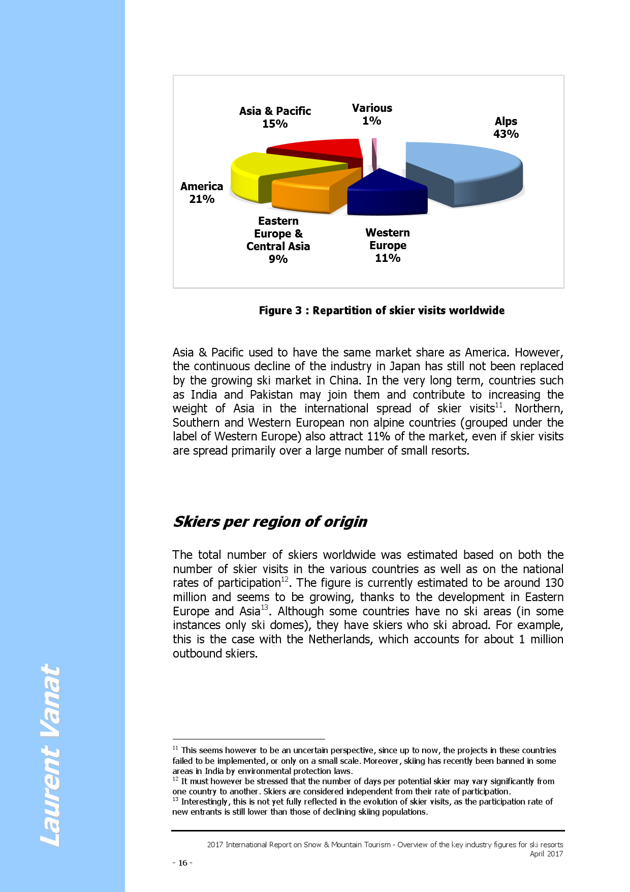 全球估计有1亿3千万滑雪爱好者。在过去十年间,每年的滑雪人数稳定在4亿人次/年的水平上。保持稳定的背后是传统滑雪市场的缓慢下滑和新兴滑雪市场的增长互相冲抵的结果。