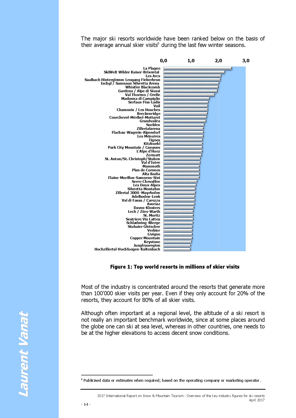 法国的拉普拉涅(La Plagne)雪场在访问人数方面独占鳌头,年访问次数高达250万次。其他年访问200万人次以上的超级大雪场还包括奥地利的skiwelt wilder Kaiser,萨尔巴赫(Saalbach)和伊施格尔(Ischgl), 法国的莱萨尔克(Les Arcs)以及加拿大的惠斯勒黑梳山(Whistler Blackcomb)。