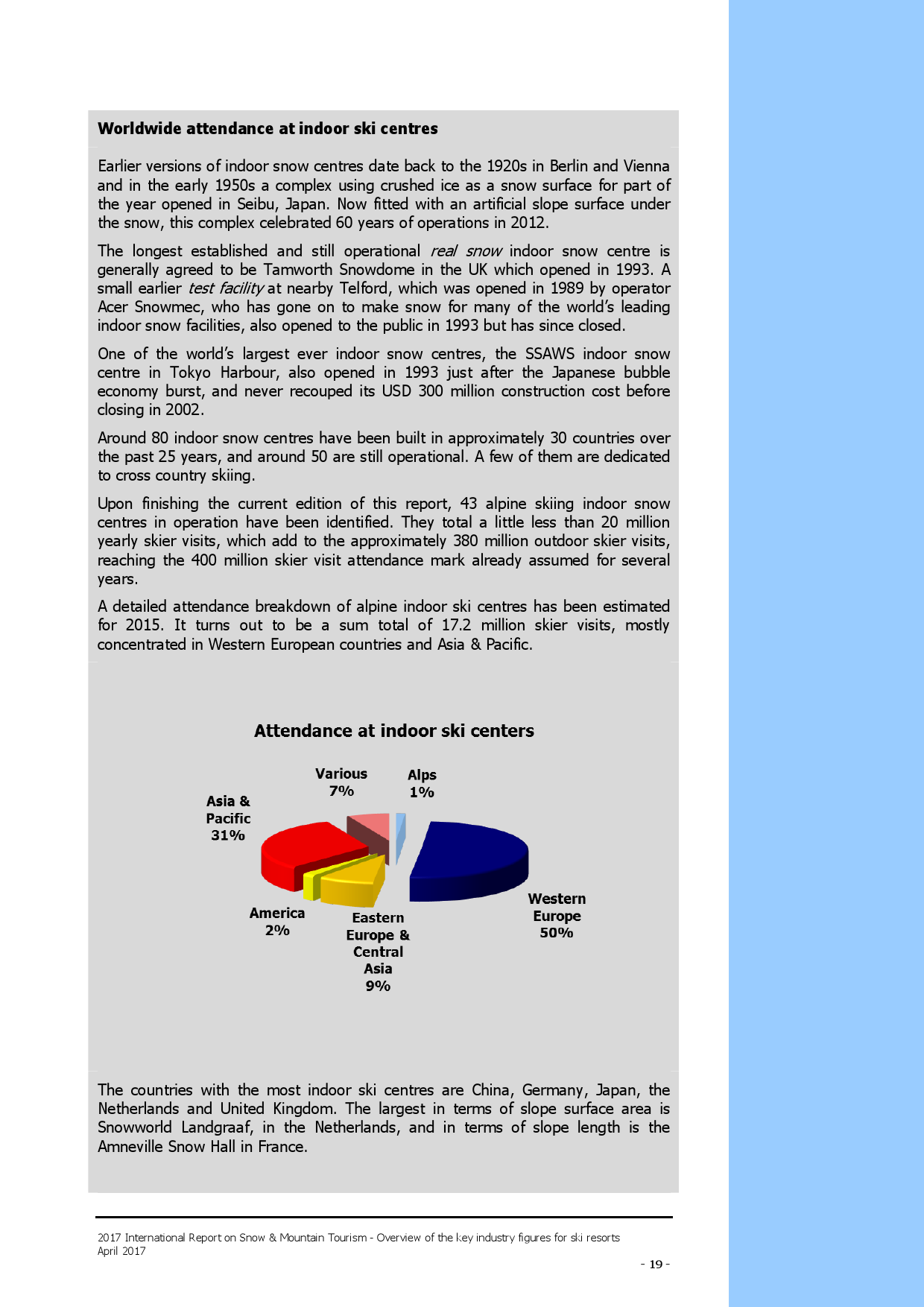 全球现在大约有43个室内滑雪场,每年贡献约1.7亿的滑雪人次。中国是世界上拥有室内滑雪场最多的国家,德国,日本,荷兰和英国紧随其后。