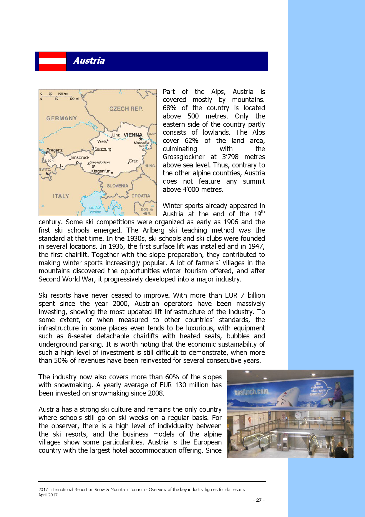 奥地利是个有深厚滑雪传统的国家。奥地利是目前世界上唯一一个把滑雪纳入学校基础教育课程大纲的国家。自2000年以来,奥地利总计花销了70亿欧元来更新缆车设备和翻新雪道,提供了一些堪称奢华的配到设施—包括加热坐垫和八座座椅式缆车。
