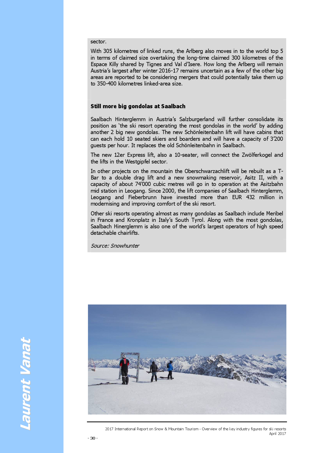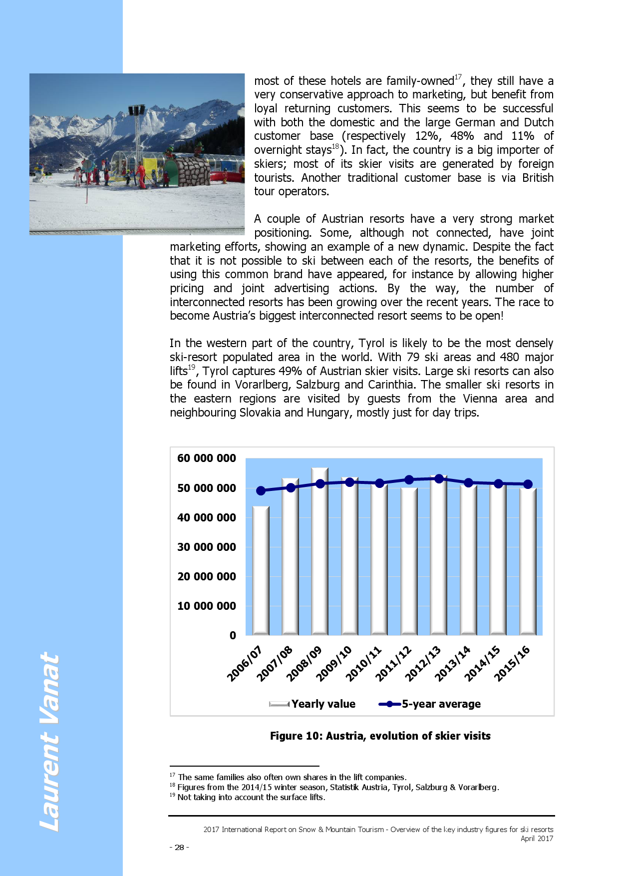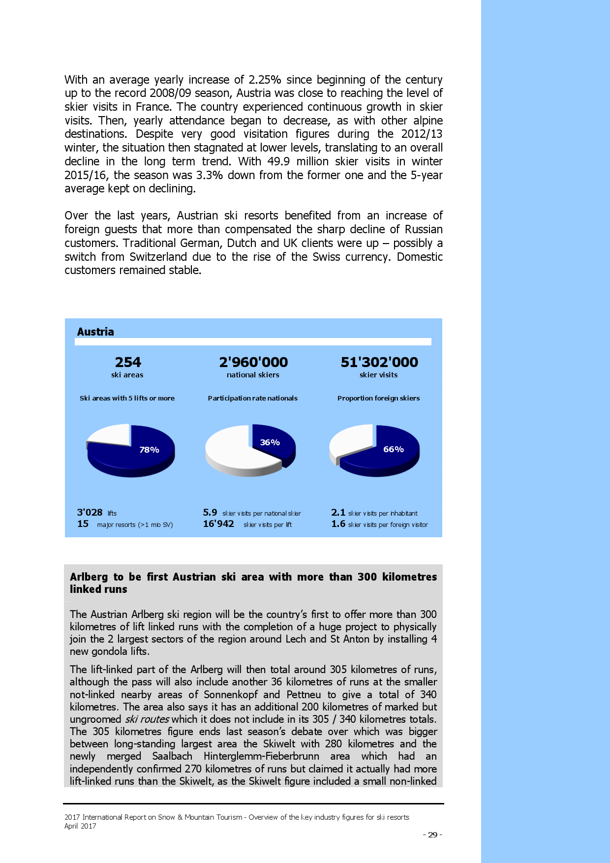 奥地利有多达66%的滑雪次数是由外国游客贡献的。奥地利的雪场越来越多的开始合并,甚至出现了Arlberg这种总雪道长超过300公里的超级巨无霸雪场。