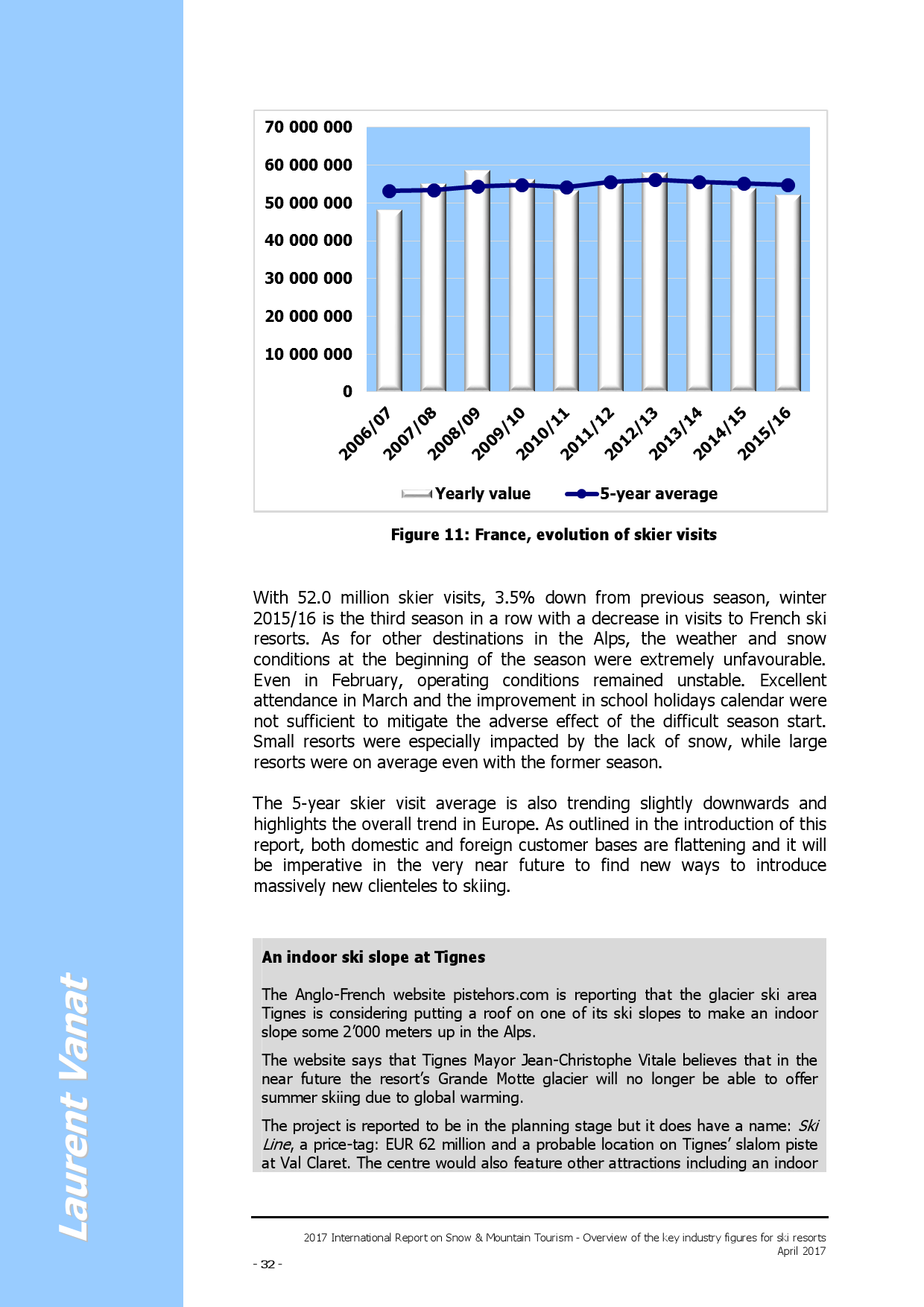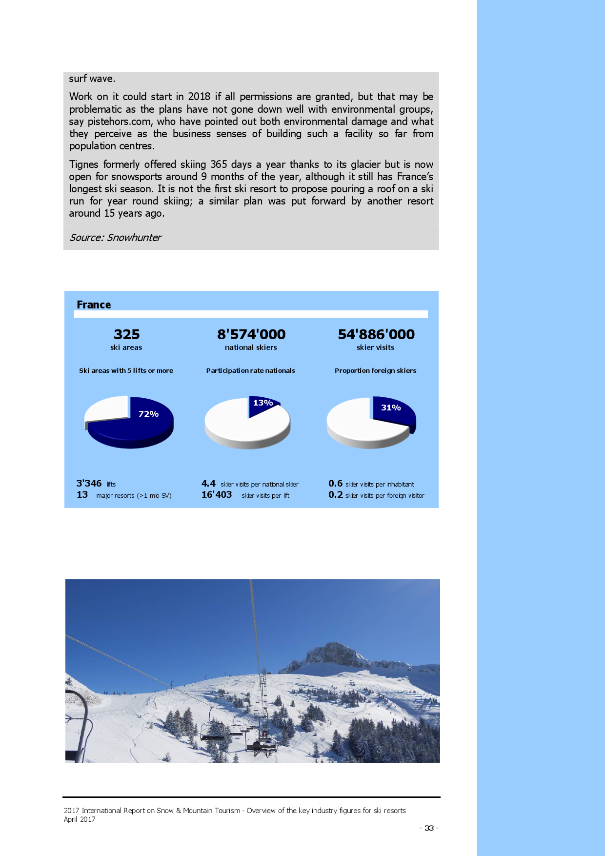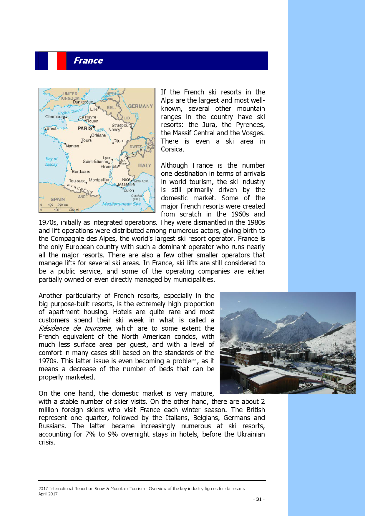 在法国,索道仍然被当做公共交通的一部分,很多索道是全部或部分当地政府控股的。上个雪季(2015/16)是法国滑雪行业连续第三个下降的年份,但是它仍然以5200万滑雪人次数为世界最高。