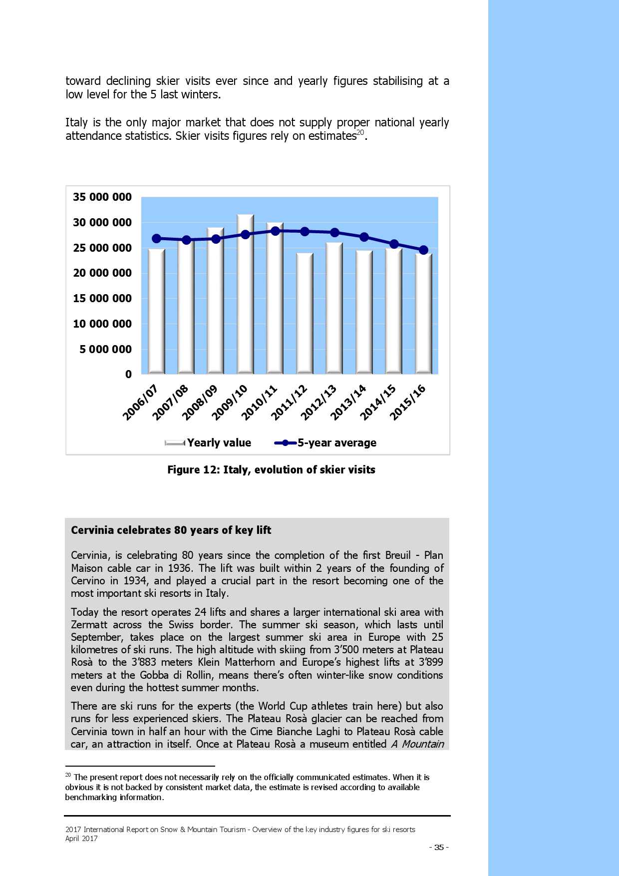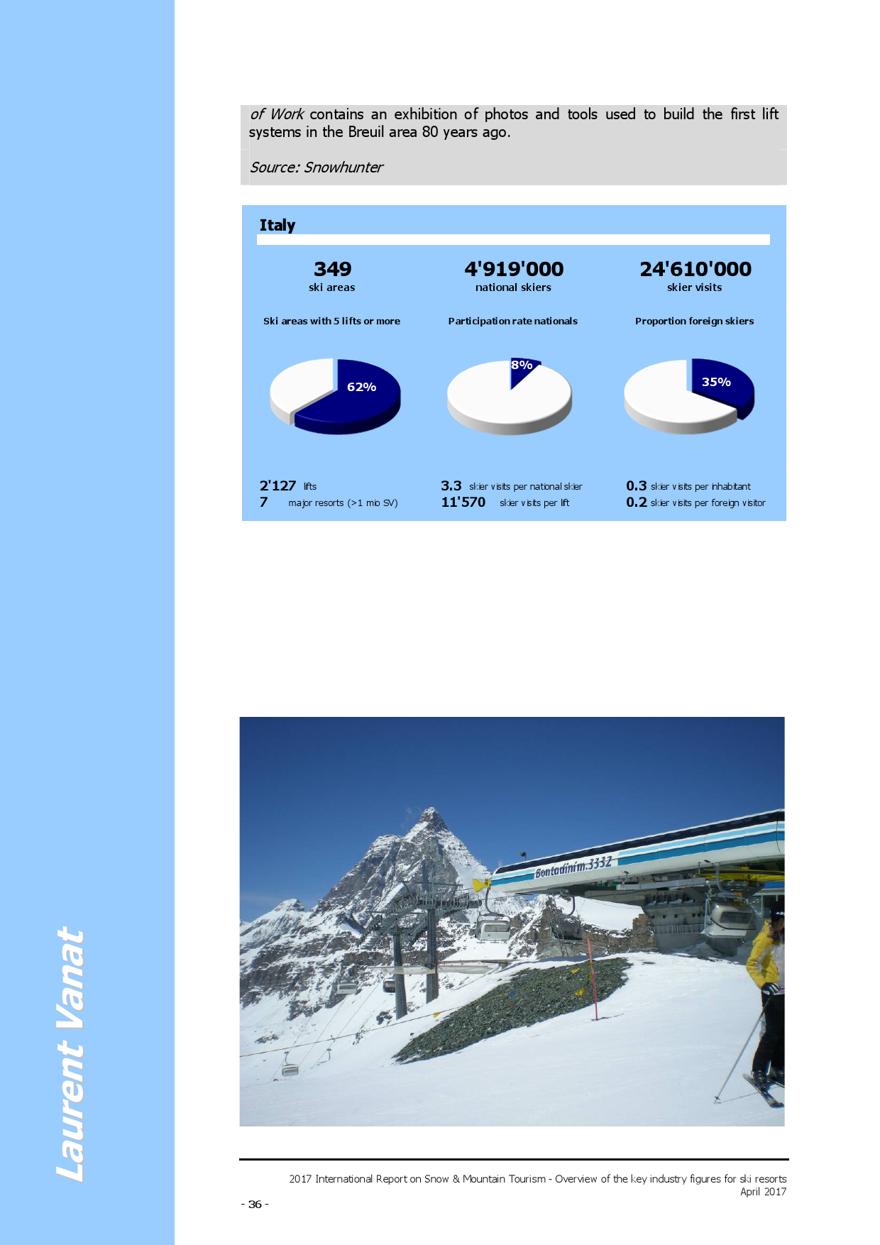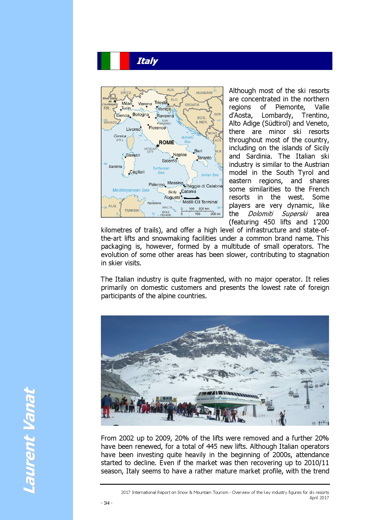 整个北部都处于阿尔卑斯山山脉的意大利拥有得天独厚的地理环境,但由于经营和宣传的问题,它的外国滑雪者来访人数是整个阿尔卑斯国家中最低的。