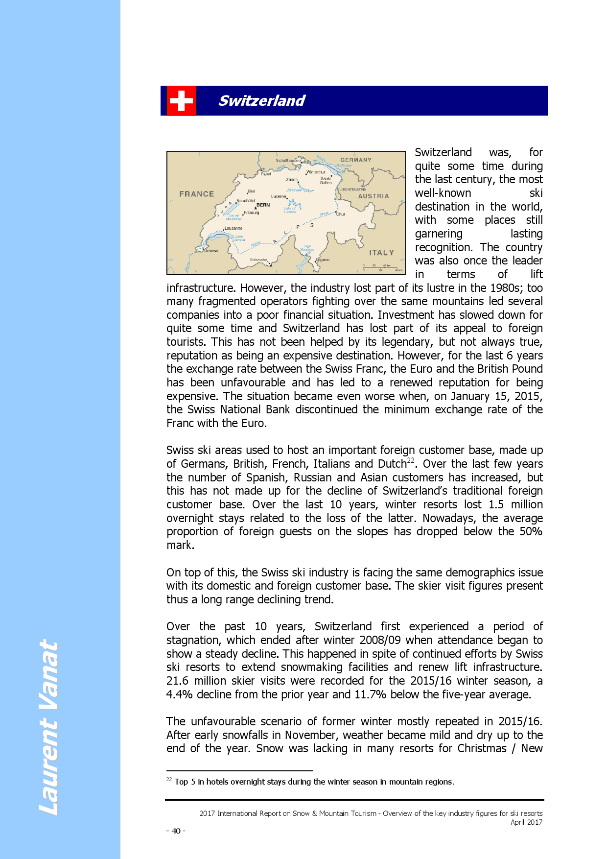 瑞士曾经以最棒和最贵的滑雪目的地而闻名于世界。但是80年代起,由于各个雪场之间市场和场地竞争过于激烈,很多雪场陷入了财务问题,导致了游客人数的下降。过去6年里,瑞士克朗的汇率也逐渐走高,进一步增加了外国滑雪者访问瑞士的成本。