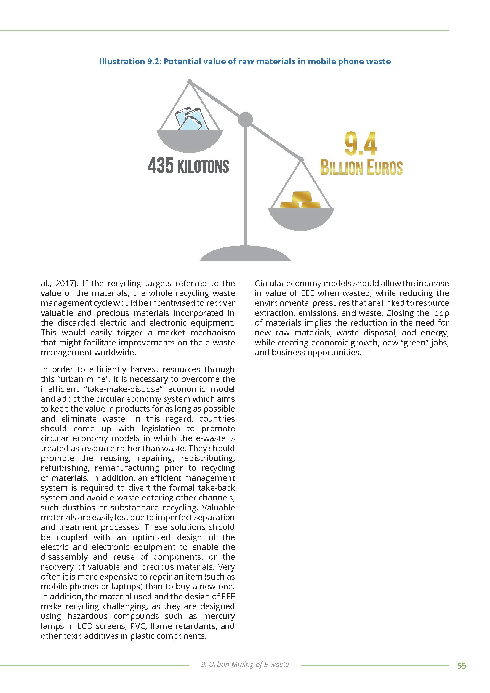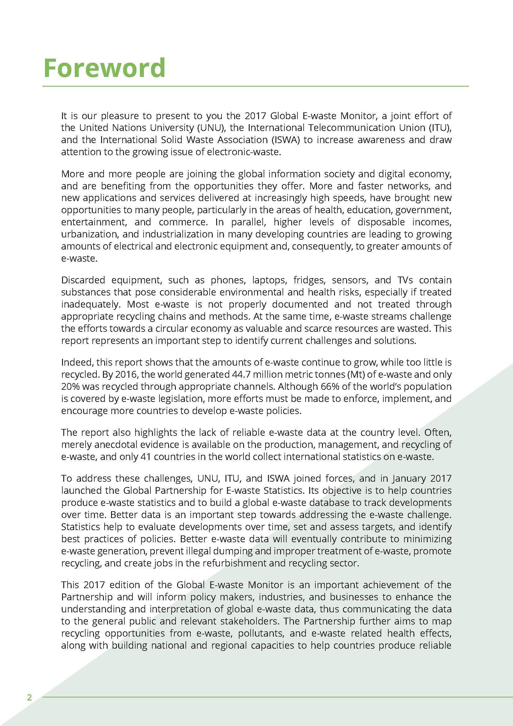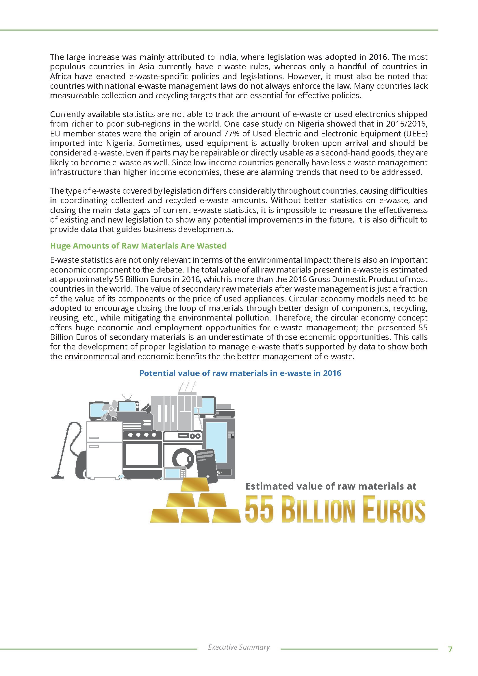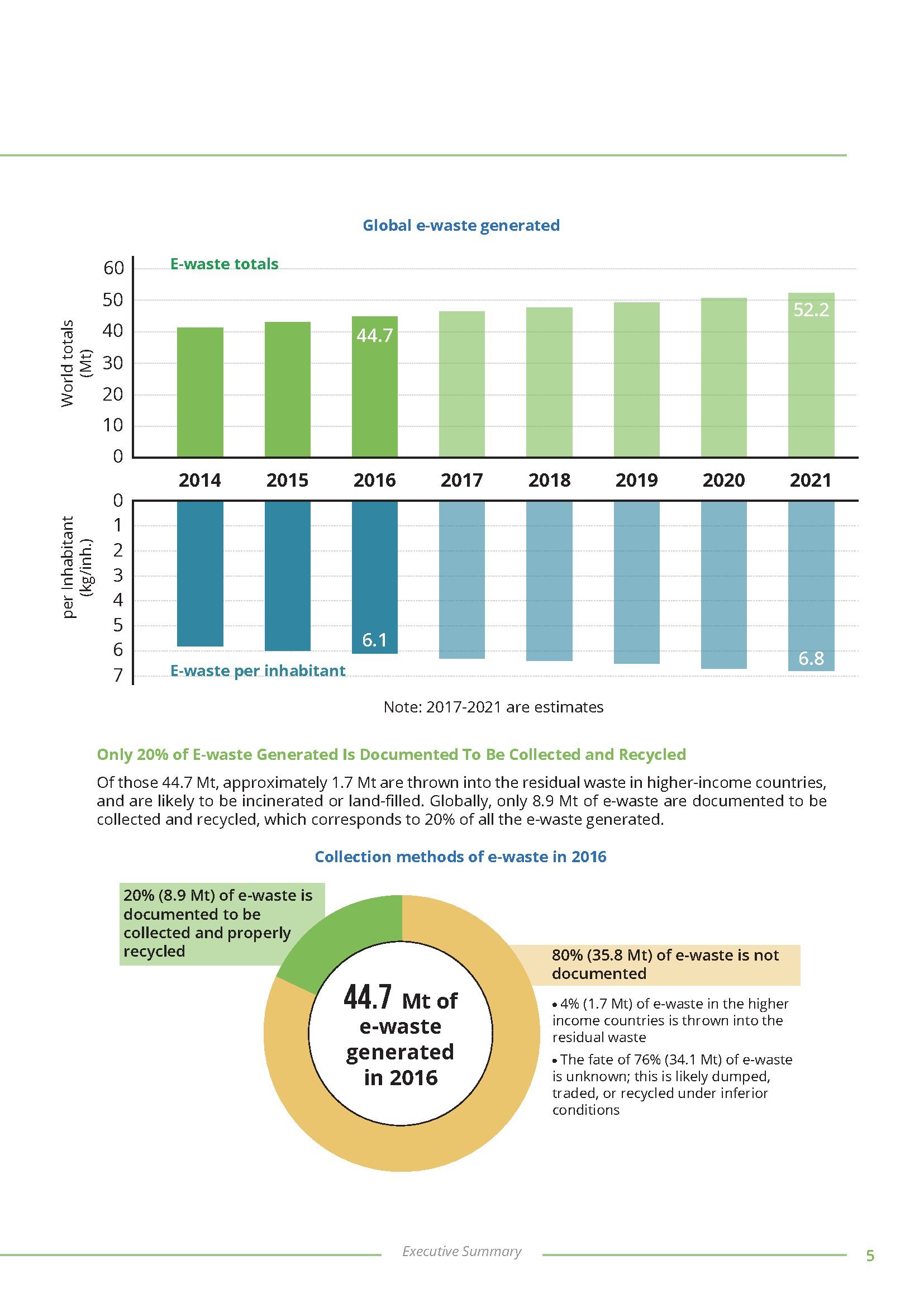 全球电子垃圾量不断提高,通过露天燃烧、不当的垃圾倾倒和不安全的处理方式,这些垃圾对环境和人类健康构成重大风险。同时,这对可持续发展也提出一些挑战。
