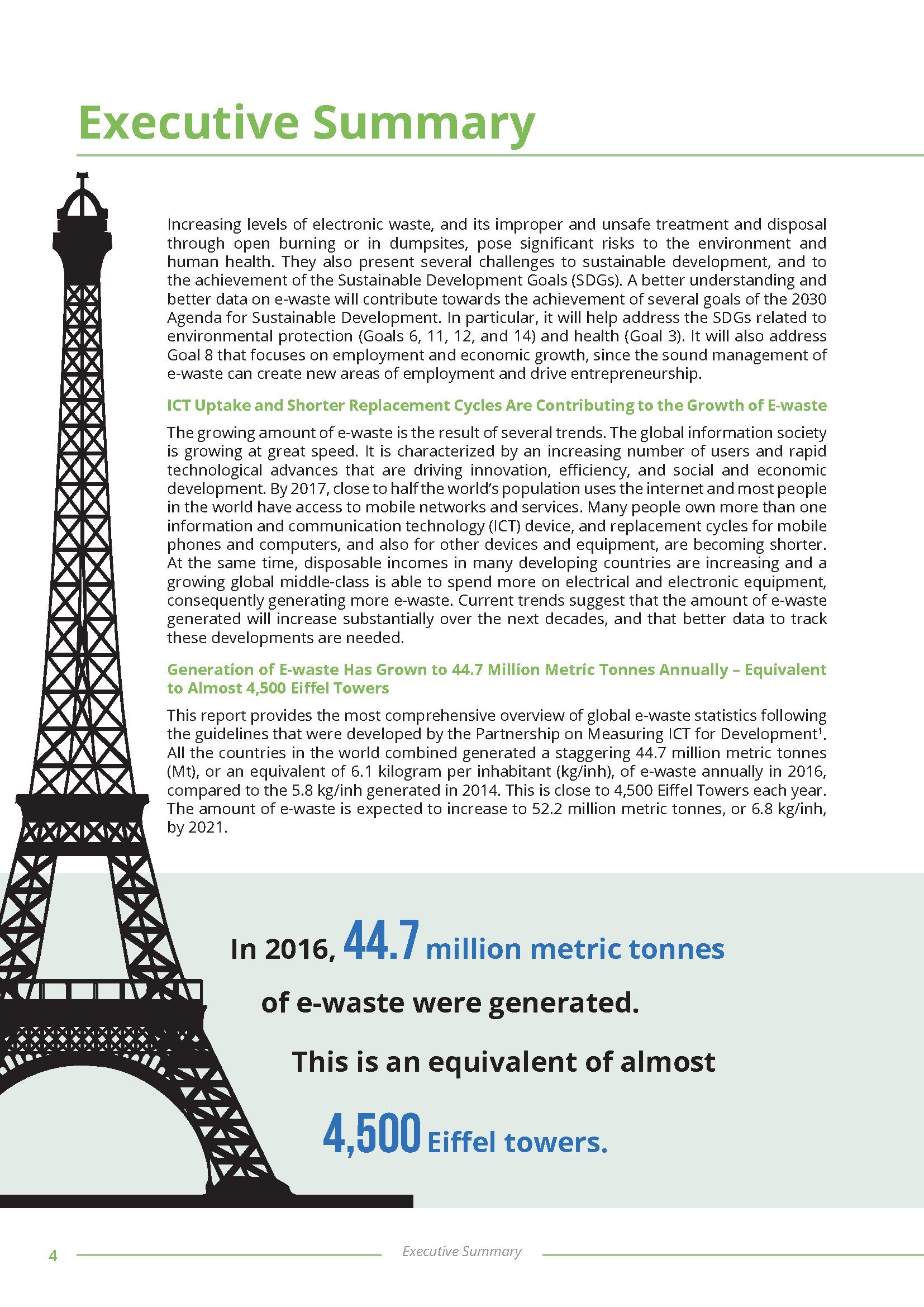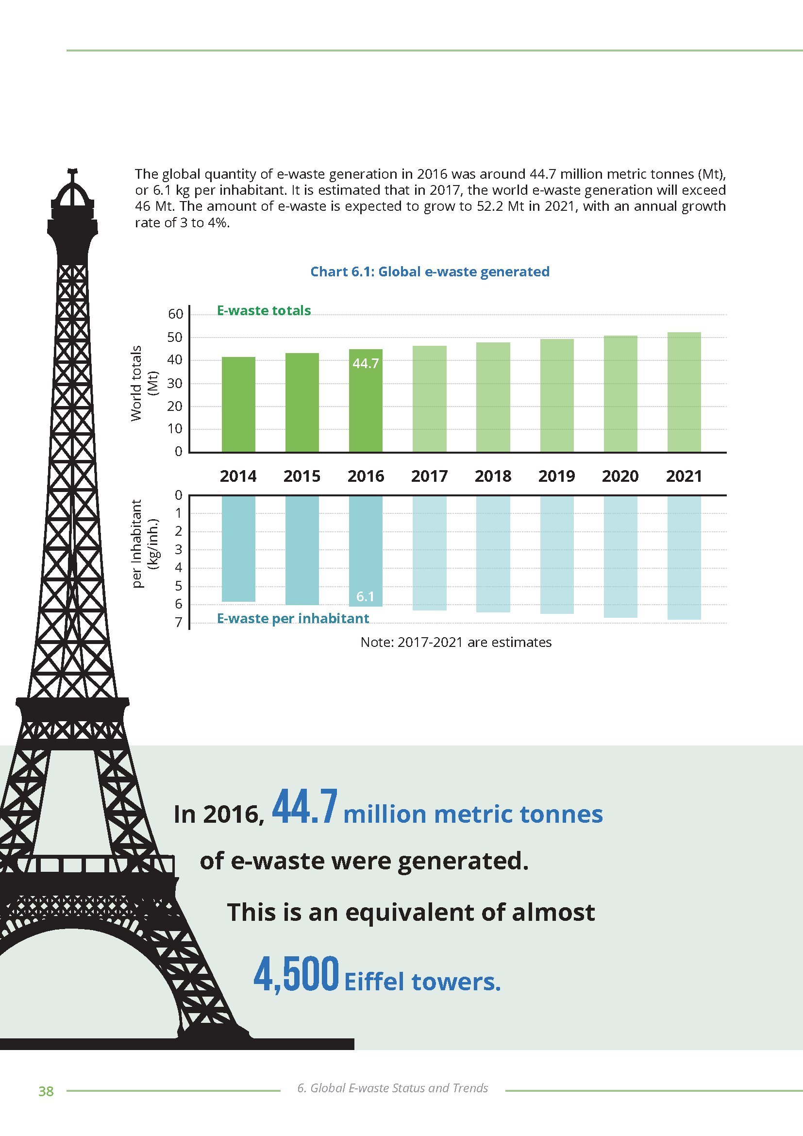 ITU发布了“2017年电子垃圾报告”,2016年全球共产生4470吨电子垃圾,这相当于4500个埃菲尔铁塔。
