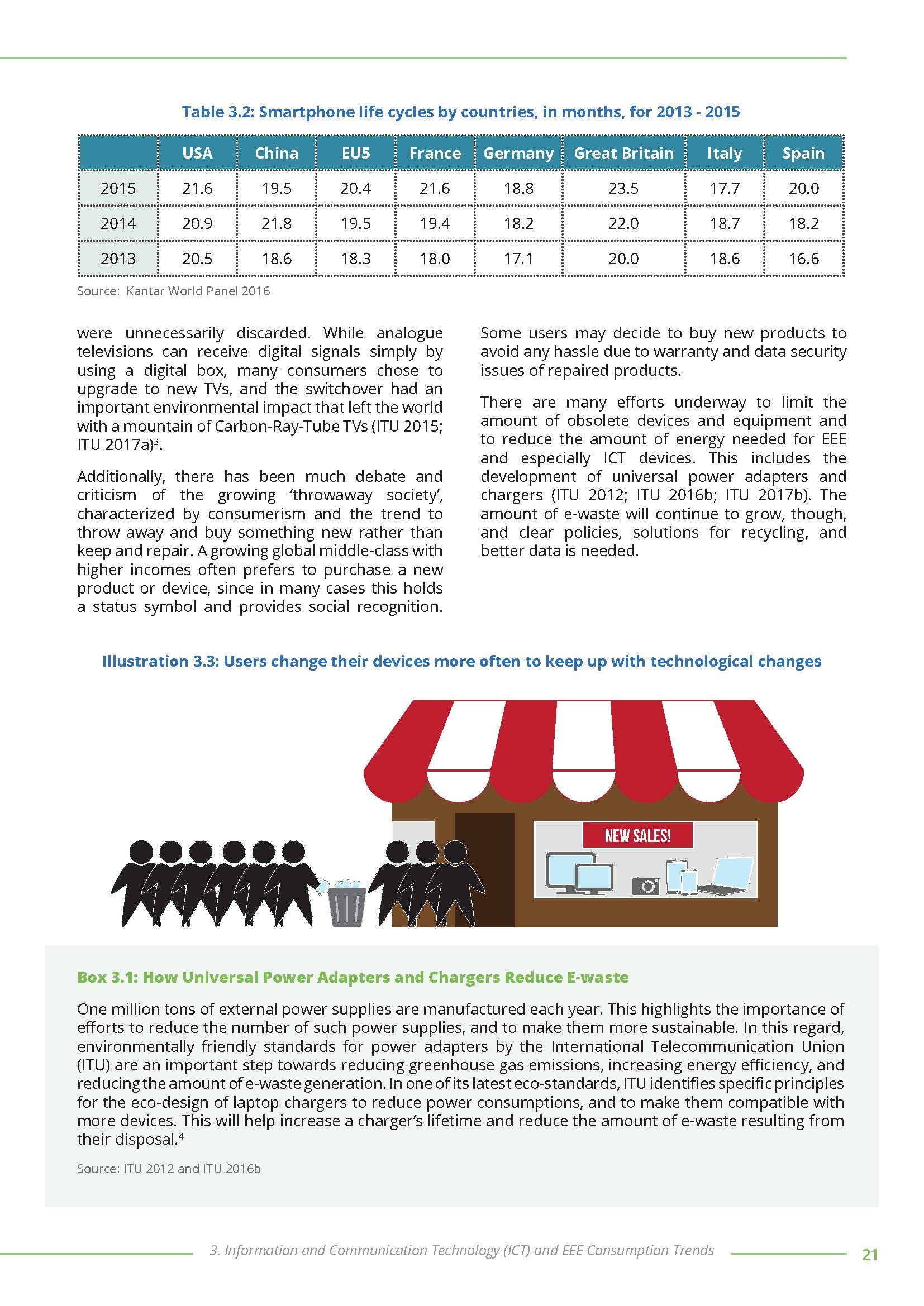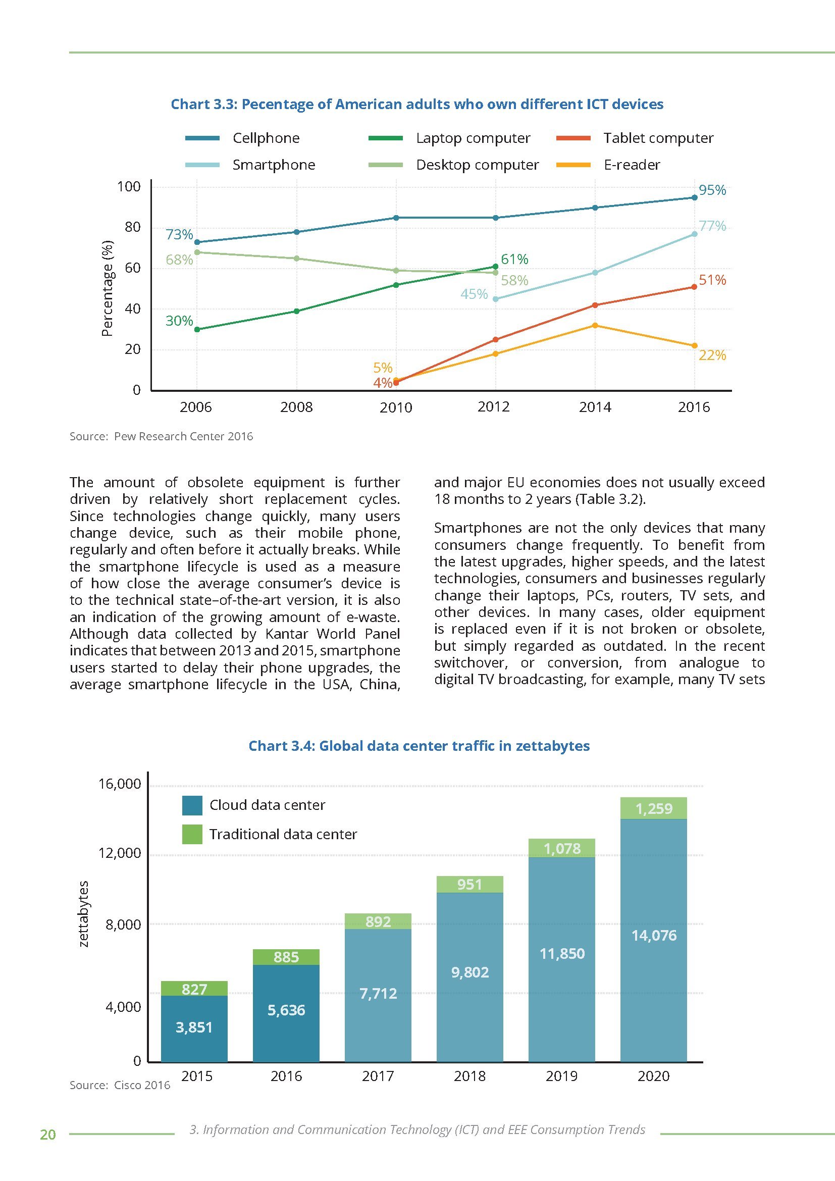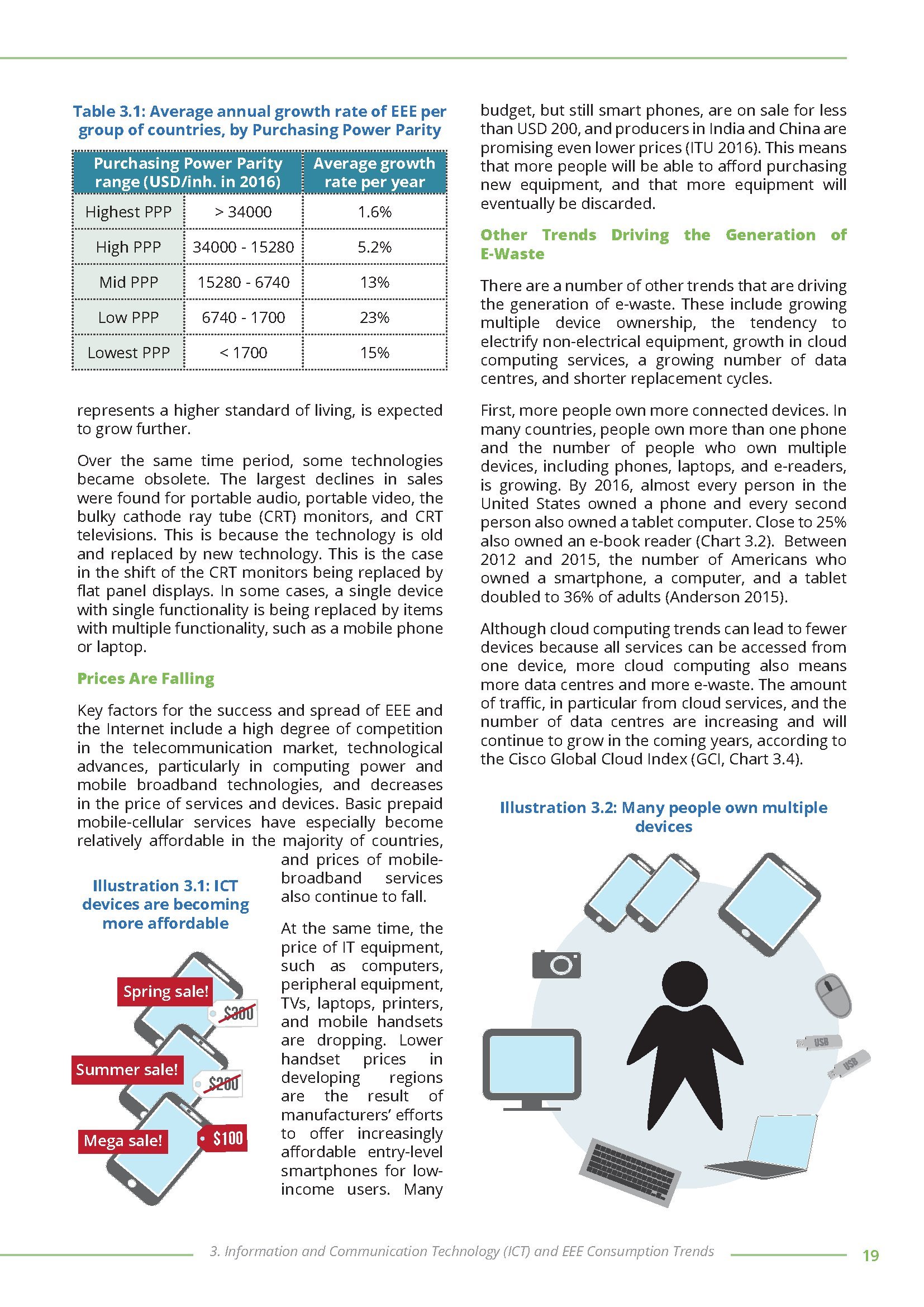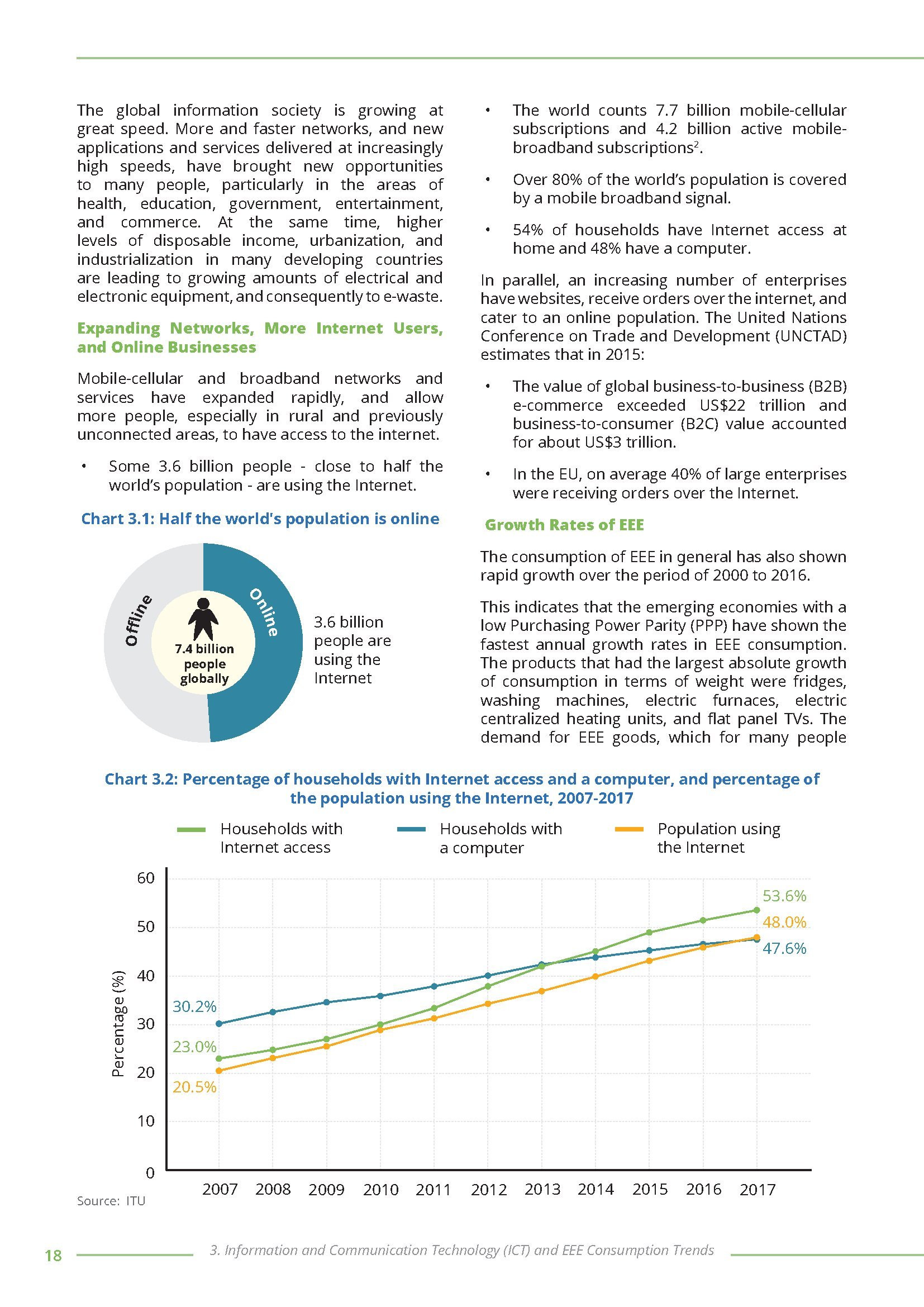 信息通信技术的应用和更换周期越来越短,推动了电子垃圾的增长。信息社会不断加速发展,其特点是用户不断增加。目前,全球仅一半人口使用互联网,许多人拥有不止一部上网设备,手机、电脑和其他设备更换周期越来越短。许多发展中国家可支配收入正在增长,中产阶级在电子产品上的消费带来更多电子垃圾。未来几十年产生的电子垃圾数量将大幅增长。