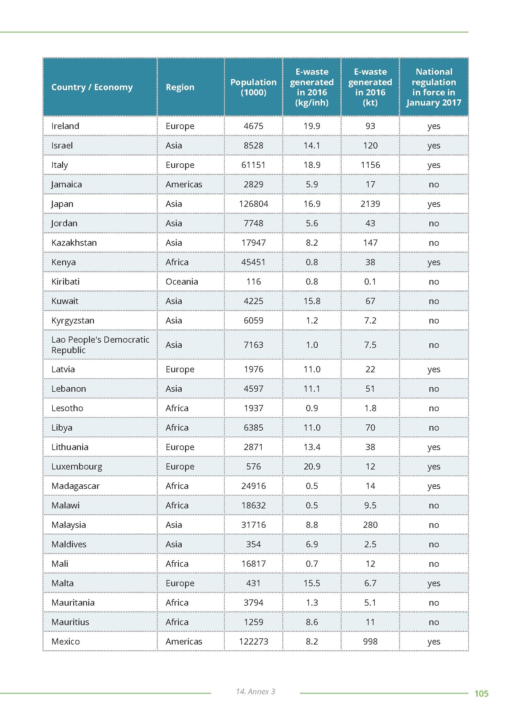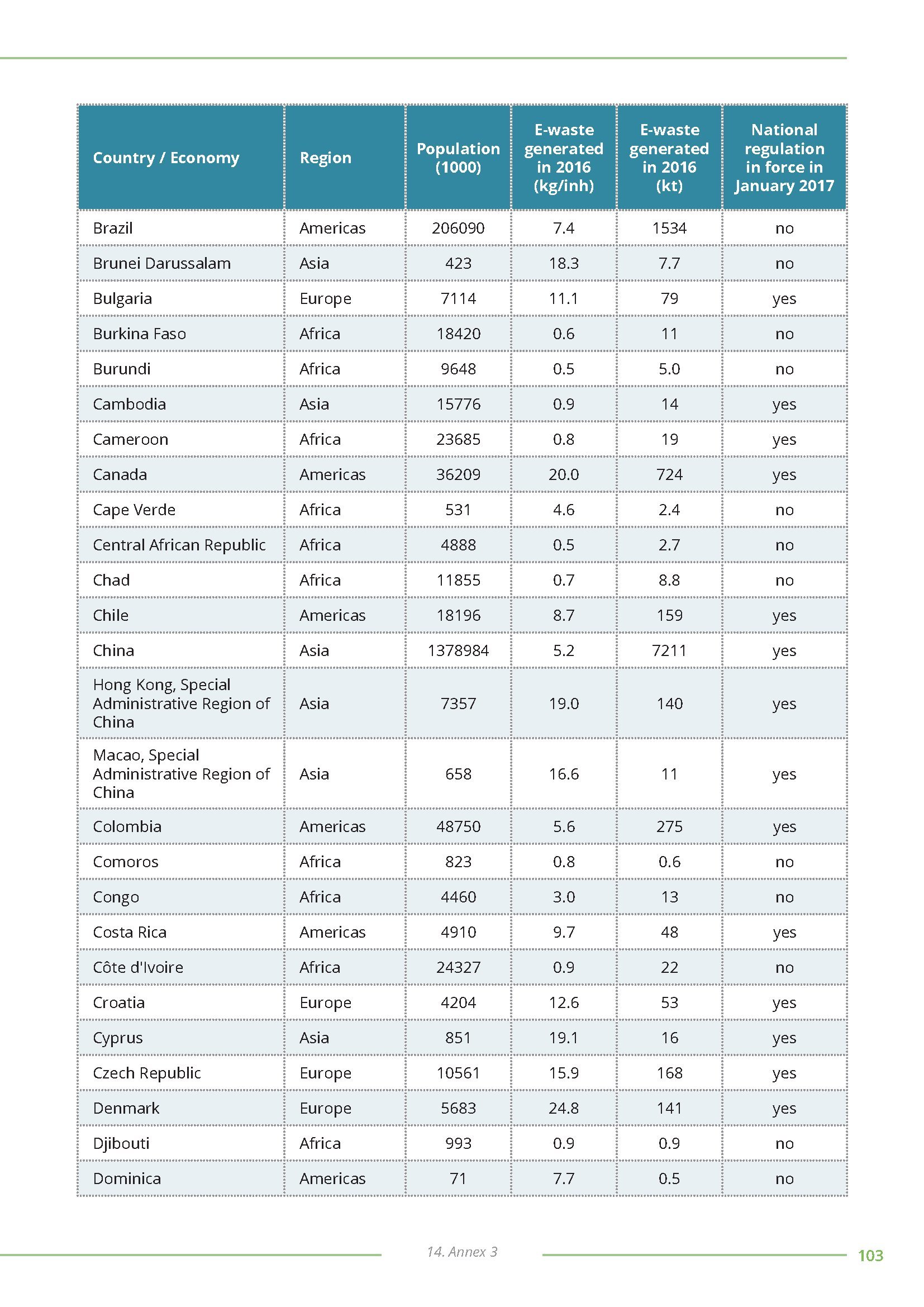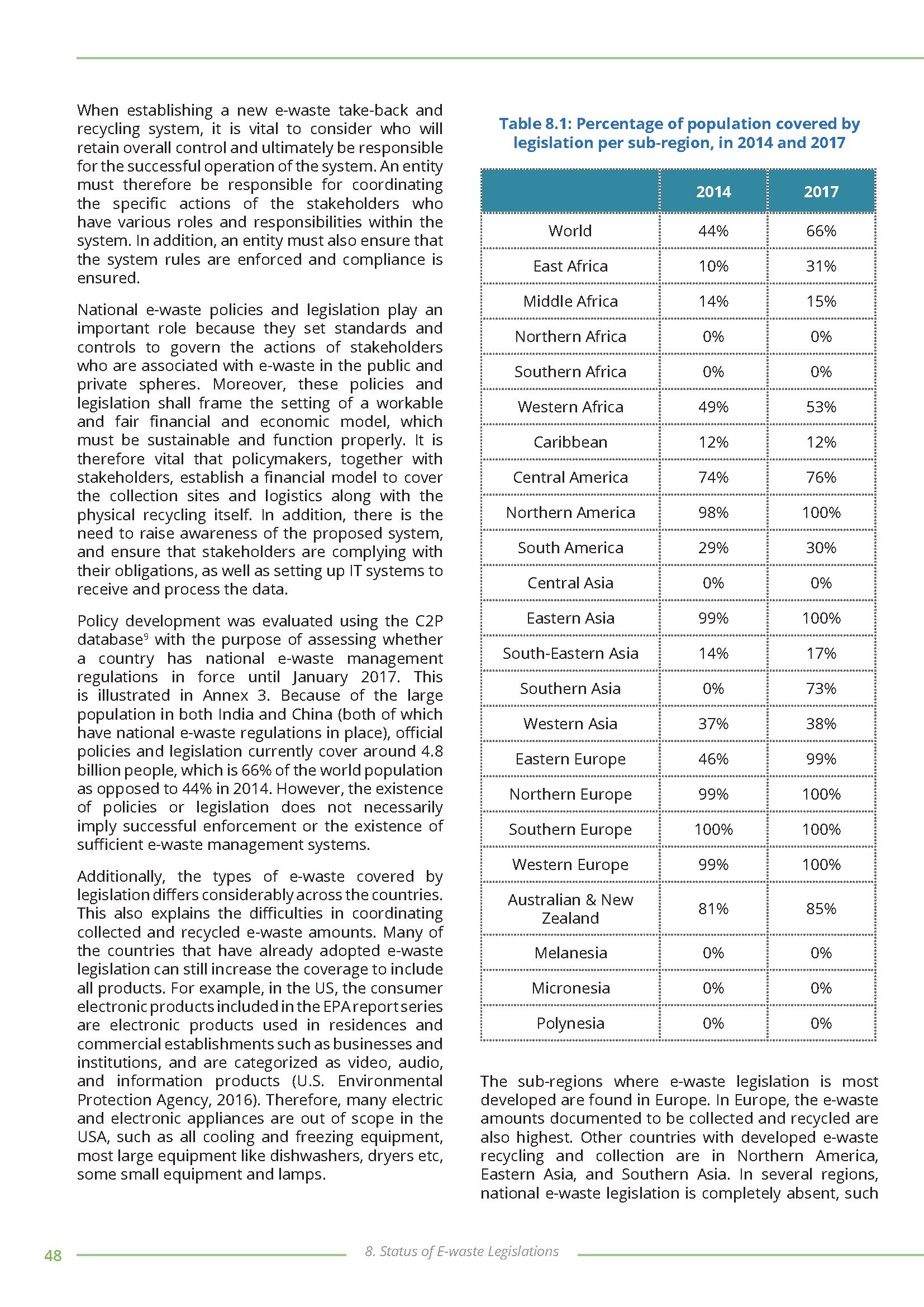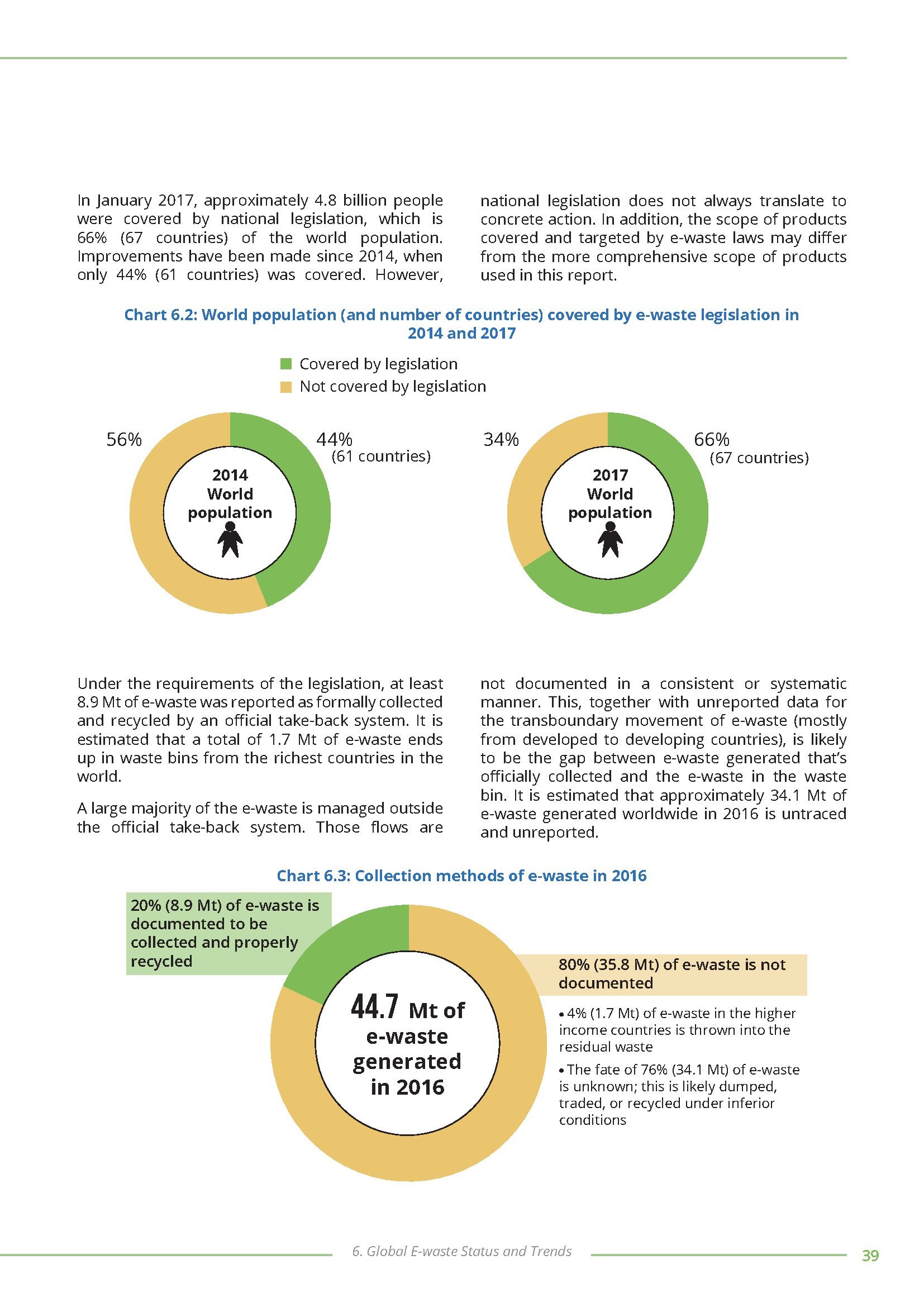 全球只有41个国家有官方的电子垃圾统计数据。在没有专门法律的国家,电子垃圾很可能被当作一般废物处理,而处理不当的风险非常高,还会排放毒素。好消息是,全球66%的人口生活在有电子垃圾管理法律的国家,比2014年的44%增长明显。